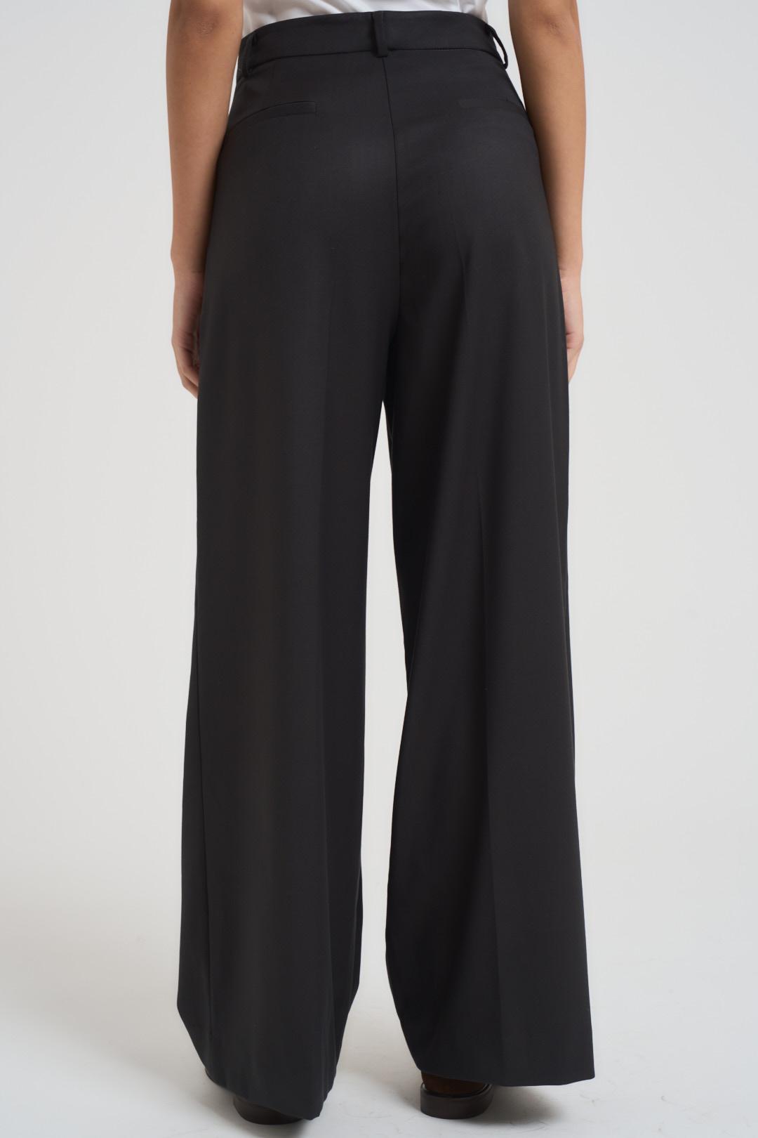 VICOLO Pantalone donna a palazzo antracite. Modello con pinces. Chiusura frontale con cerniera e bottone. Passanti in vita. Due tasche oblique frontali. Due tasche a filetto sul retro. Composizione: 63% Poliestere, 34% Viscosa, 3% Elastane. La modella è alta 176 cm e indossa la taglia S.