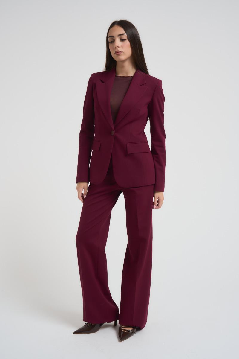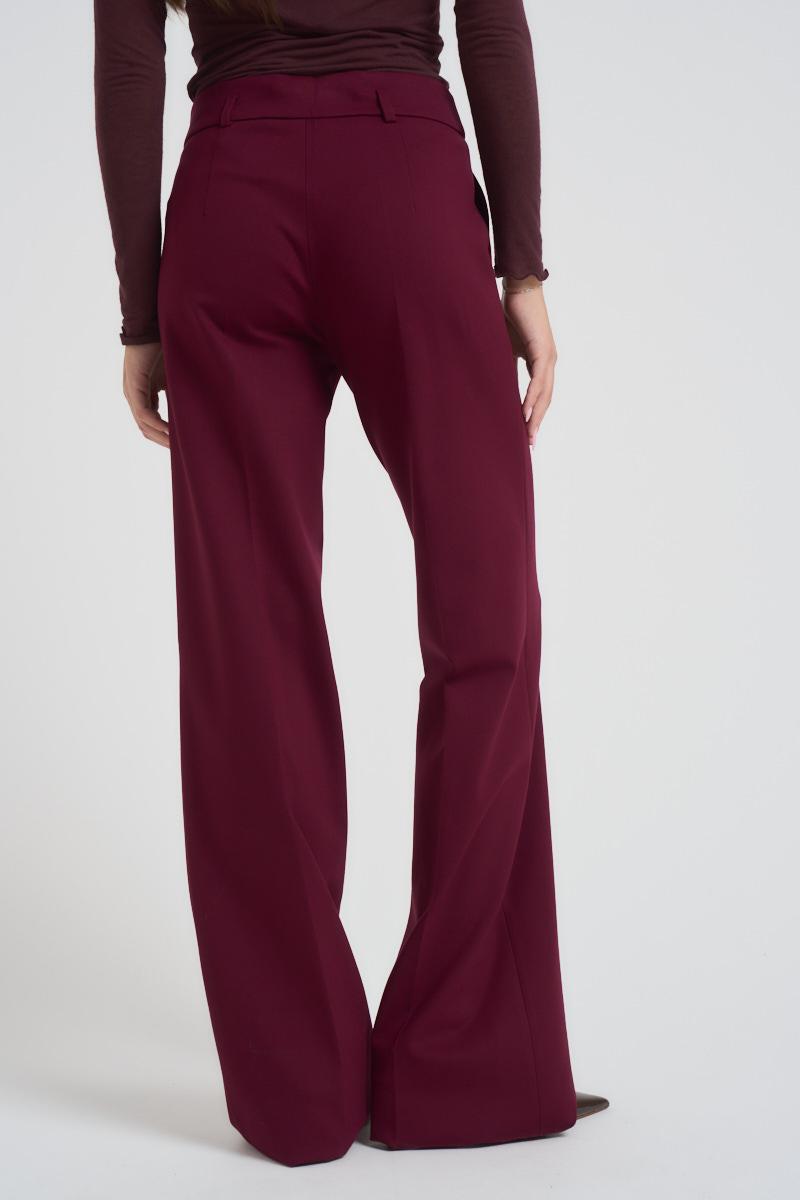 MANILA GRACE Pantalone donna a palazzo bordeaux. Modello gamba dritta con chiusura a zip e due bottoni. Due tasche a filetto. Composizione: poliestere e viscosa. La modella è alta 176cm e indossa la taglia S.