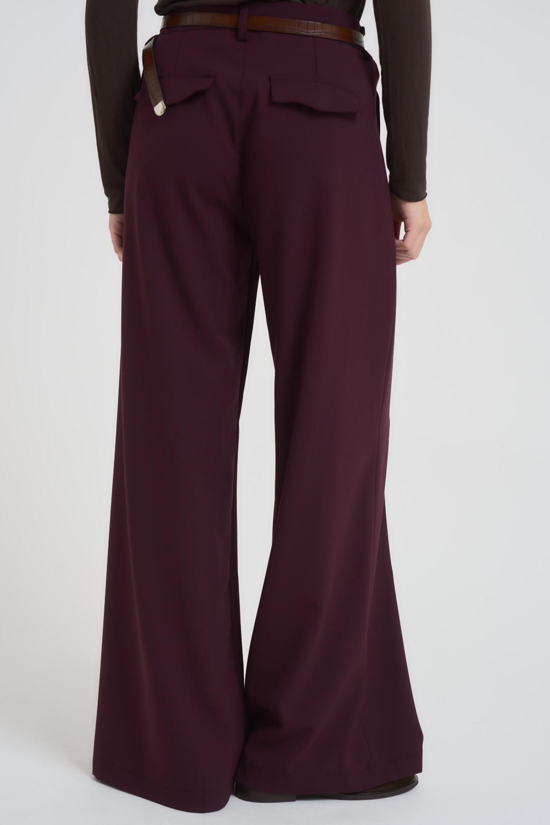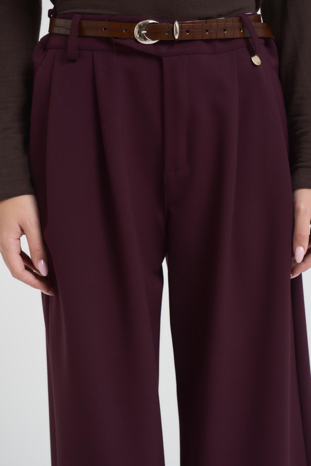INCLOTH Pantalone donna a palazzo bordeaux. Modello con pinces. Chiusura frontale con zip e bottone. Tasche sul davanti all'italiana. Tasche sul retro con patta. Passanti in vita. Composizione: 64%Poliestere 33%Viscosa 3%Elastan. La modella è alta 172 cm e indossa la taglia S.