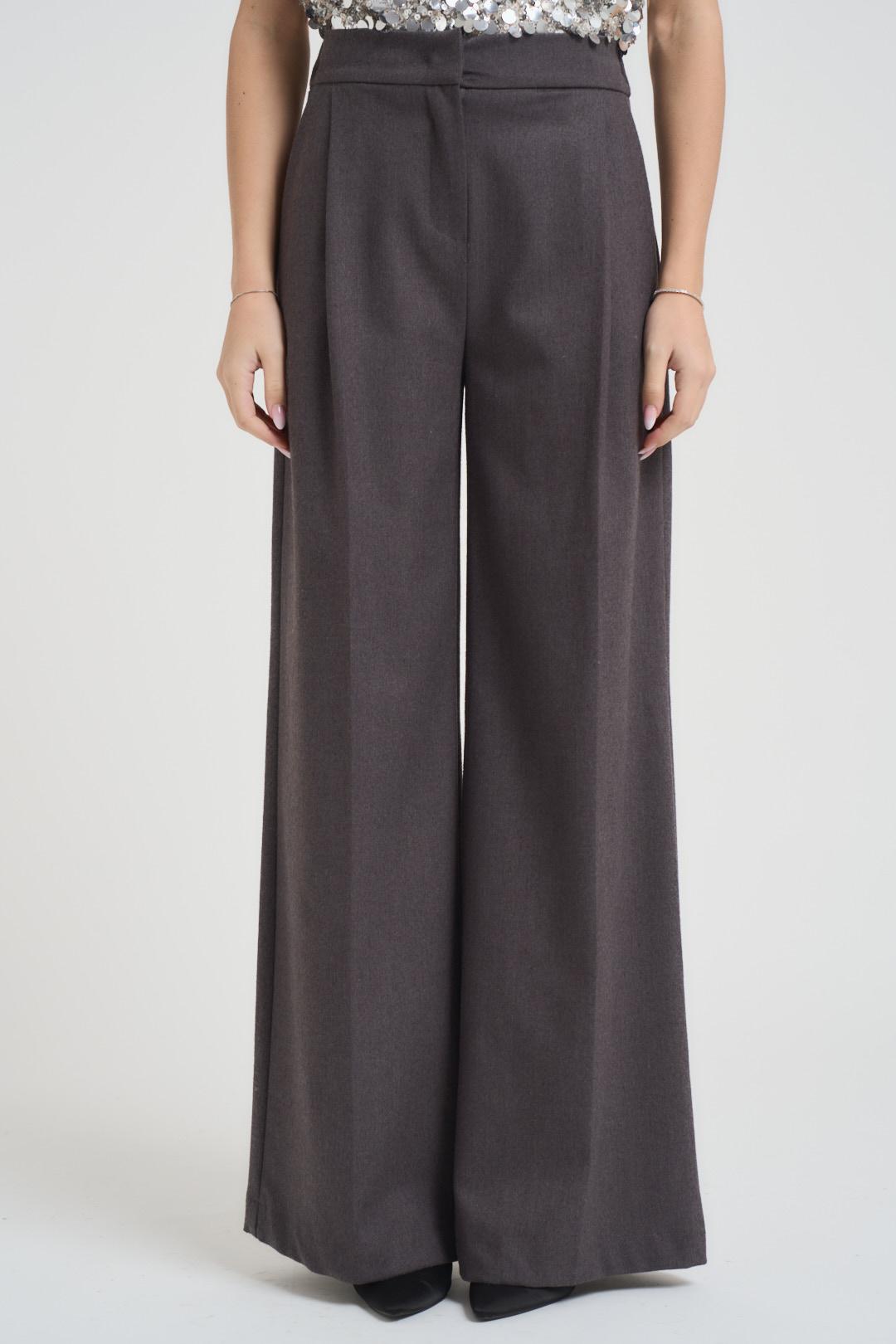 MARYLEY Pantalone donna a palazzo grigio. Modello gamba dritta, elastico sul retro e chiusura con gancetto e zip. Due tasche a filetto laterali. Composizione: 64% poliestere 34% viscosa 2% elastane. La modella è alta 176 cm e indossa la taglia S.