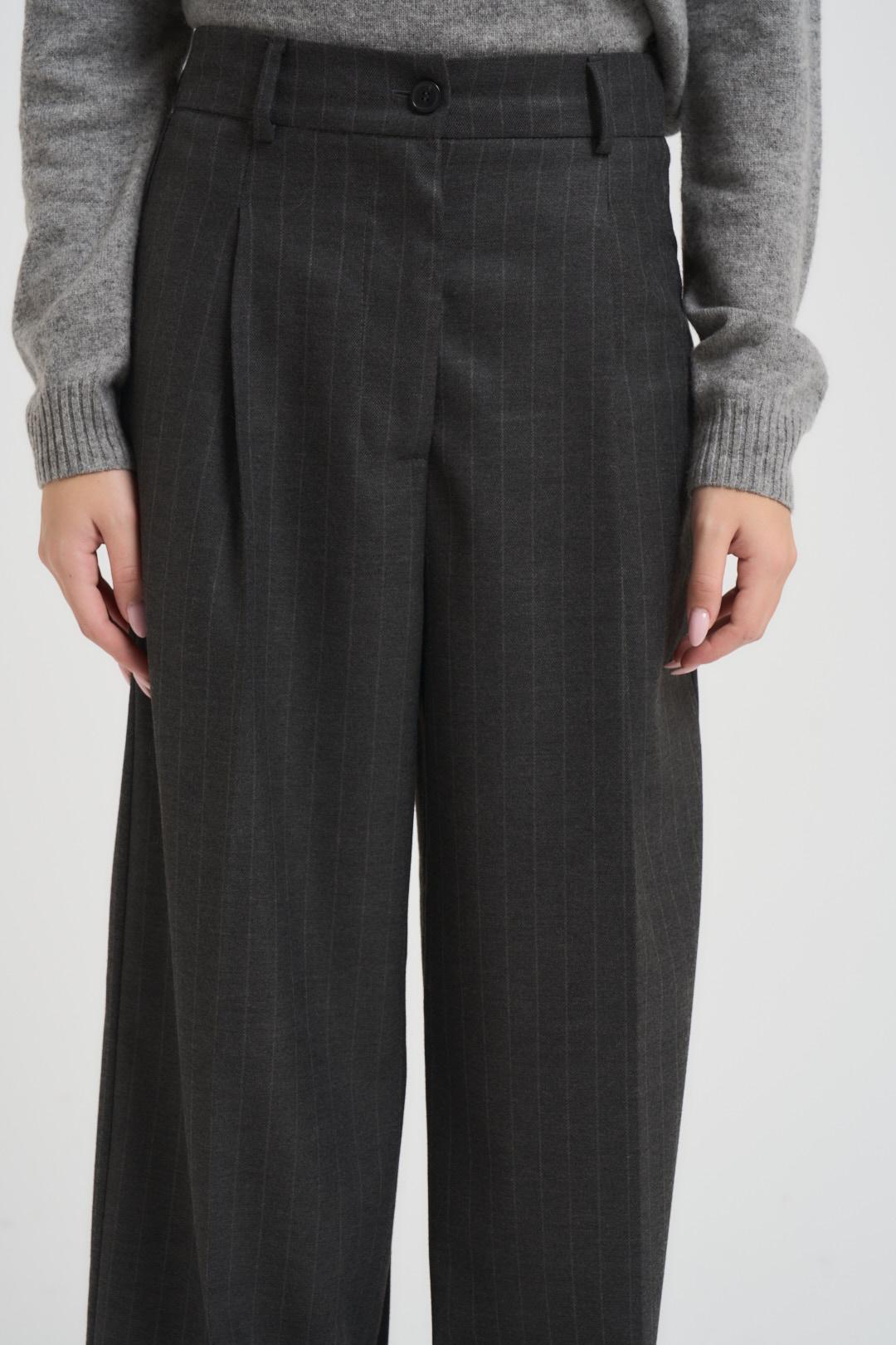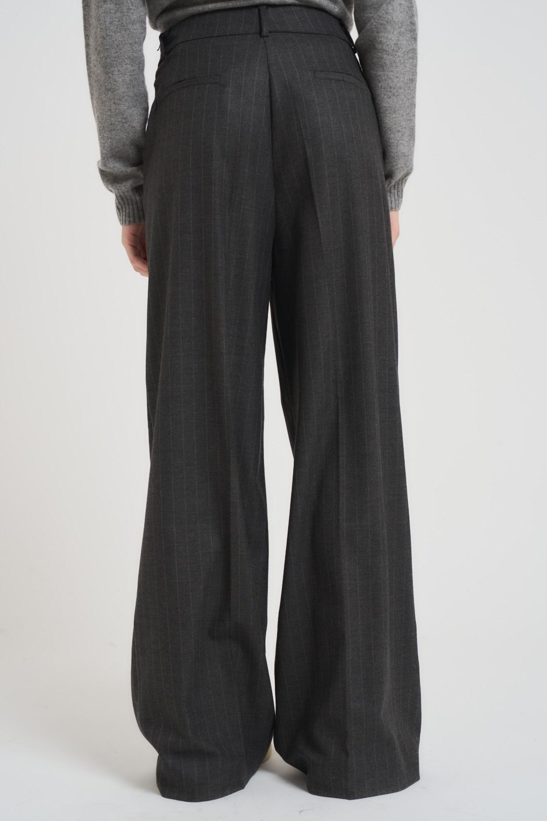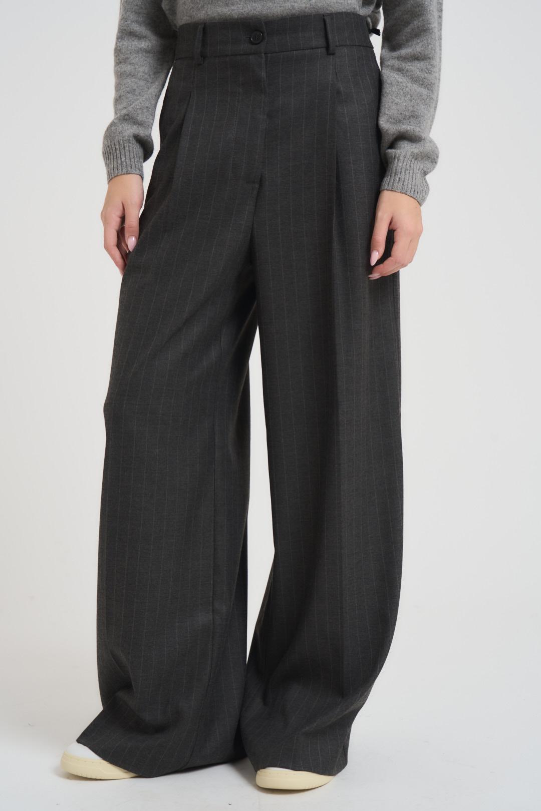 VICOLO Pantalone donna a palazzo grigio antracite. Modello con due tasche a filetto, passanti in vita e chiusura con zip e bottone. Composizione: viscosa e poliestere. La modella è alta 176cm e indossa la taglia S.