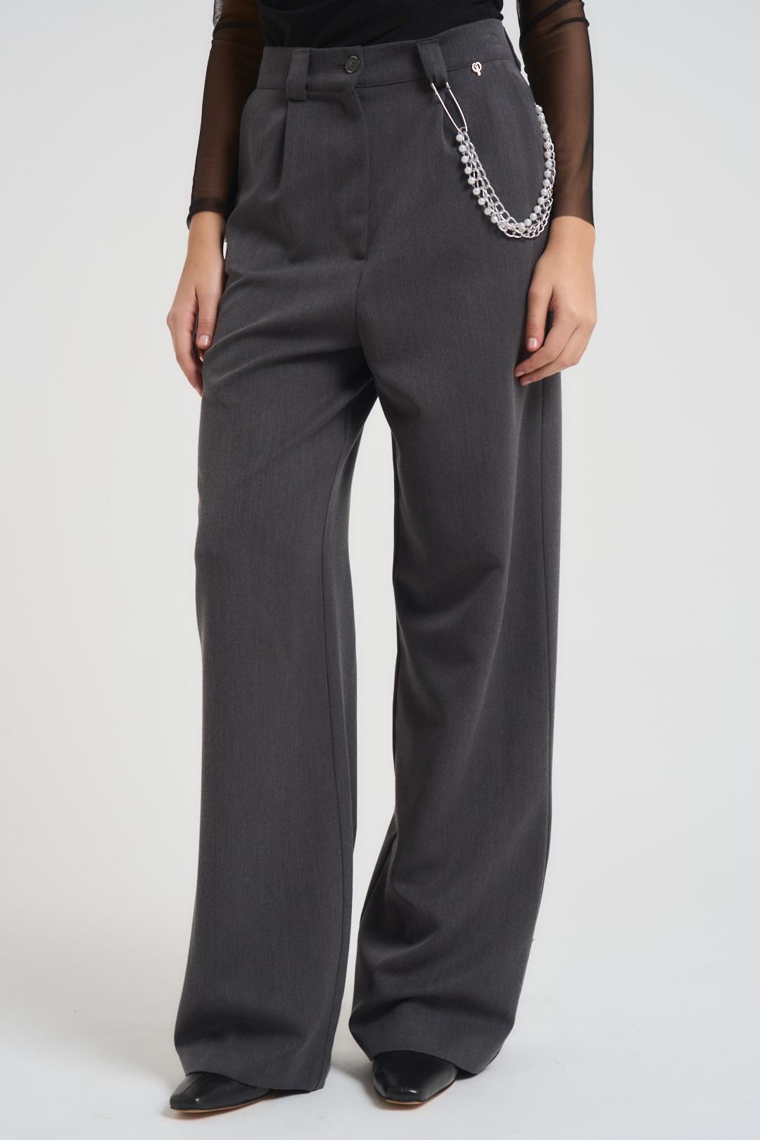 PHILIA Pantalone donna a palazzo grigio scuro. Modello con pinces. Chiusura frontale con zip e bottone. Passanti in vita. Catena rimovibile in vita. Composizione: 96% poliestere, 4% elastan. La modella è alta 176 cm e indossa la taglia S.