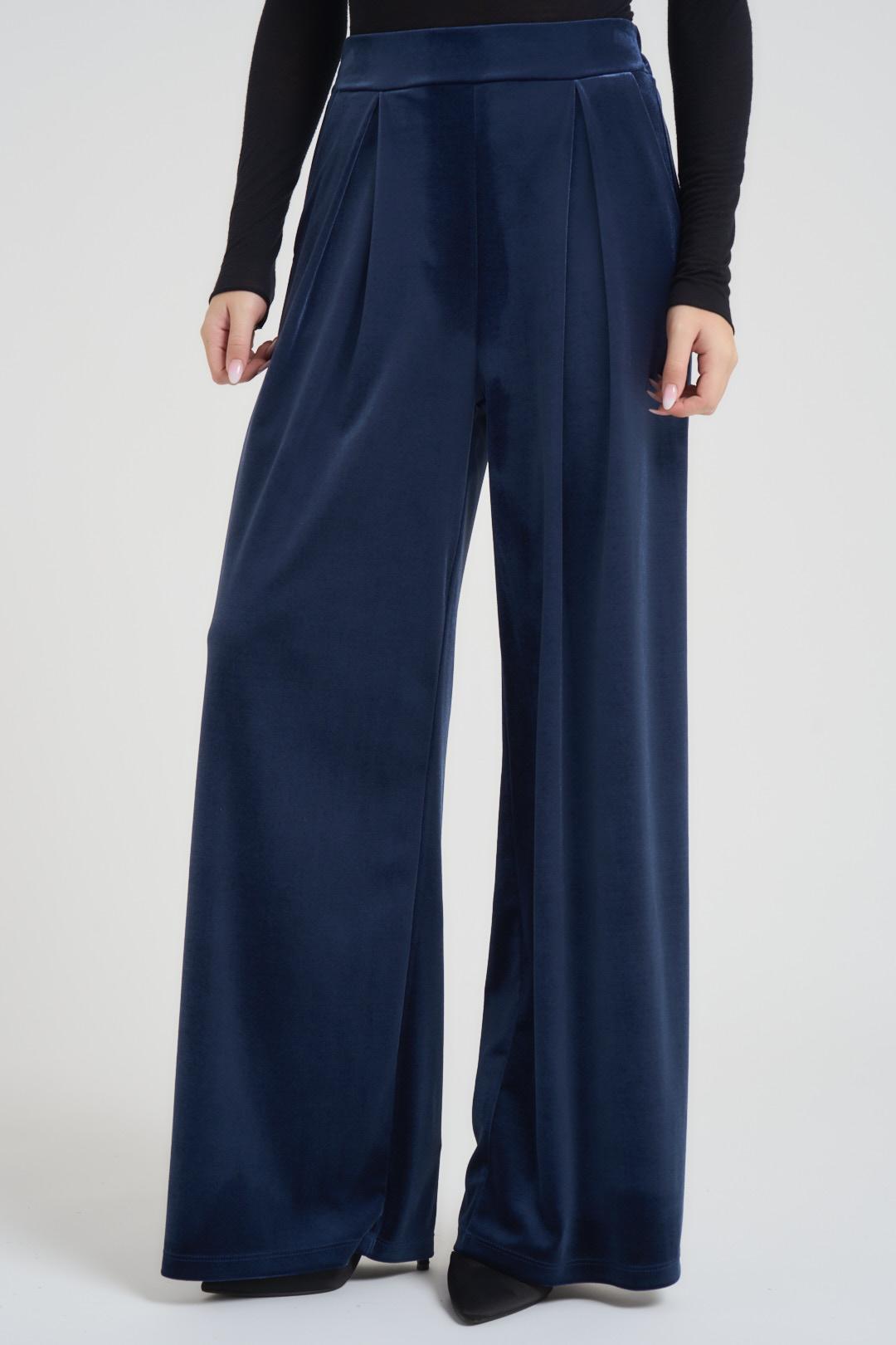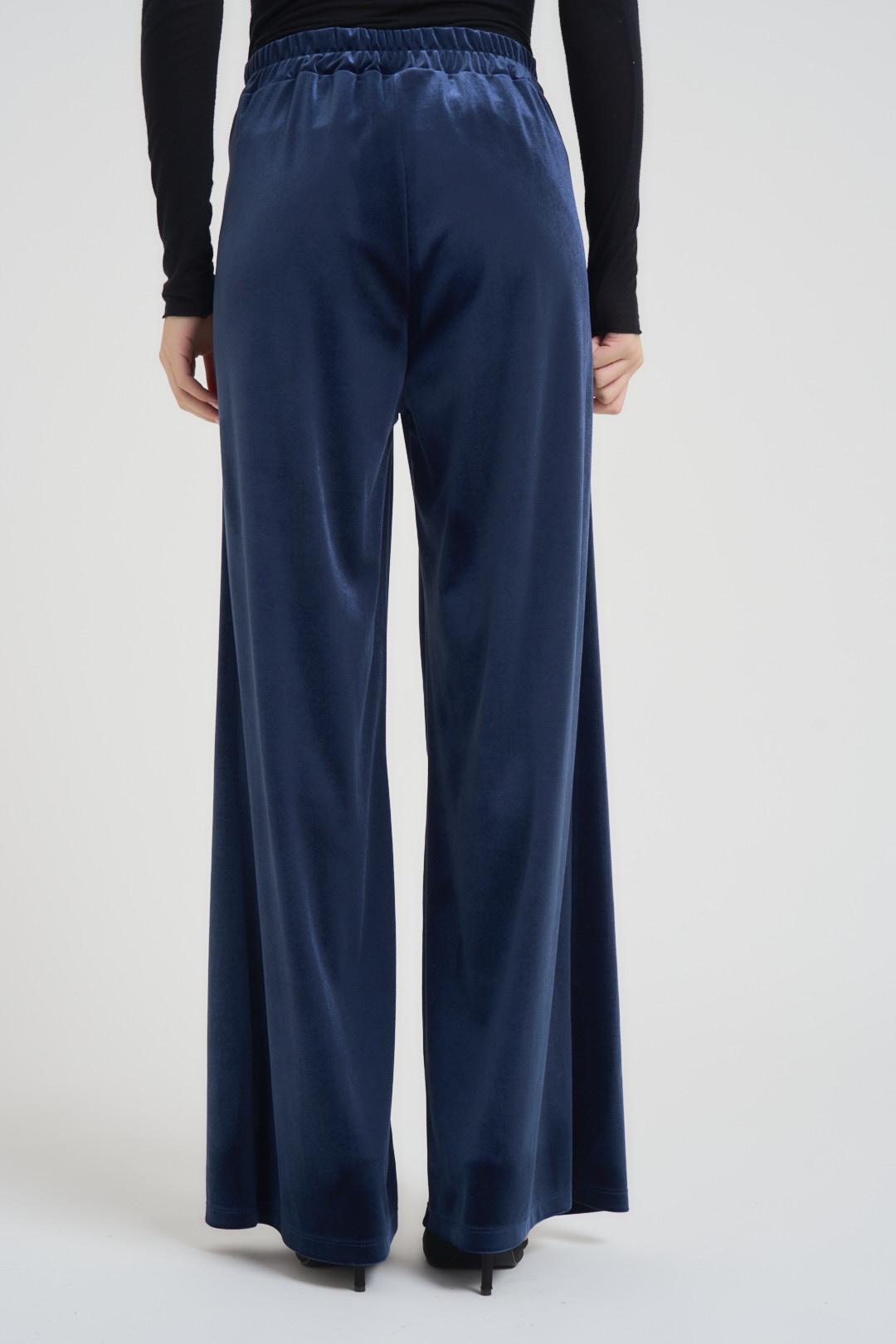 TENSIONE IN Pantalone donna a palazzo in velluto blu. Modello con elastico in vita, due tasche a filetto. Composizione: 100% poliestere. La modella è alta 172 cm e indossa la taglia S.