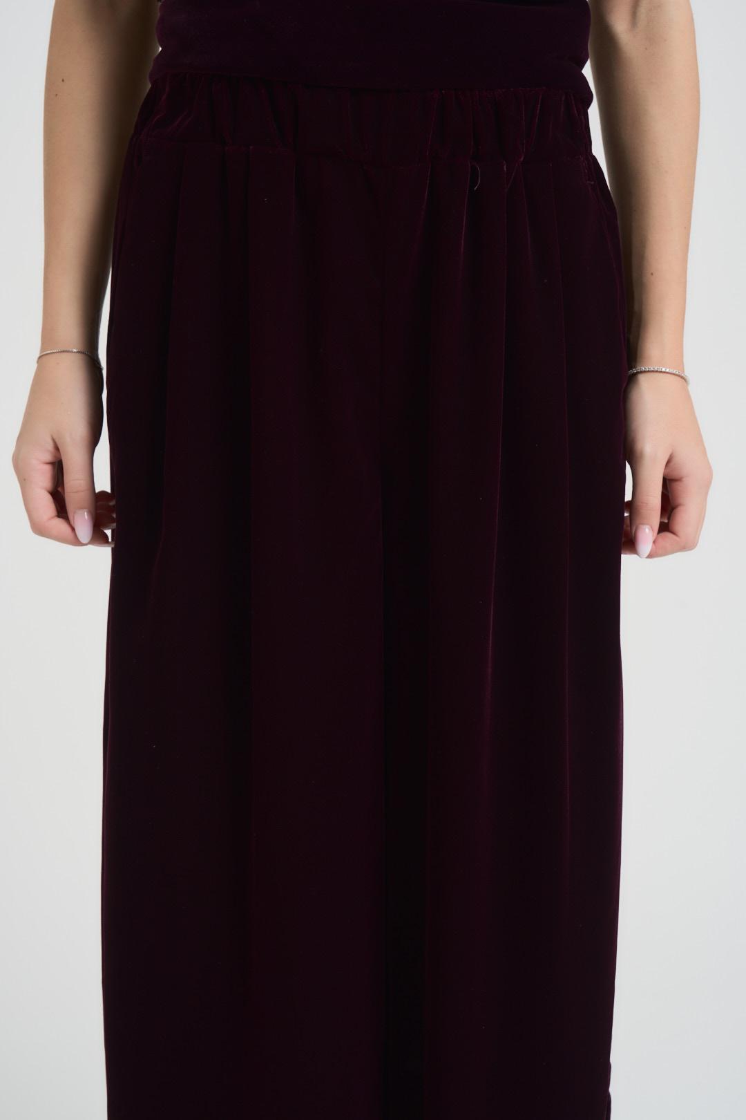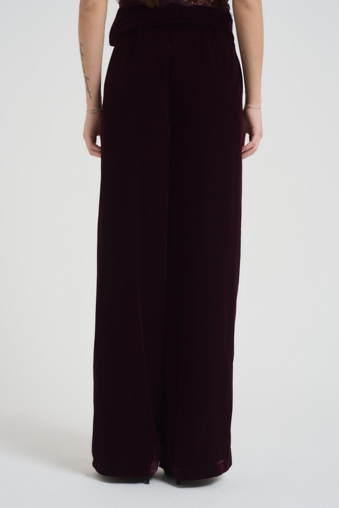 VICOLO Pantalone donna a palazzo in velluto bordeaux. Modello over, con due tasche a filetto e elastico in vita. Composizione: 100% poliestere. La modella è alta 172 cm e indossa la taglia S.