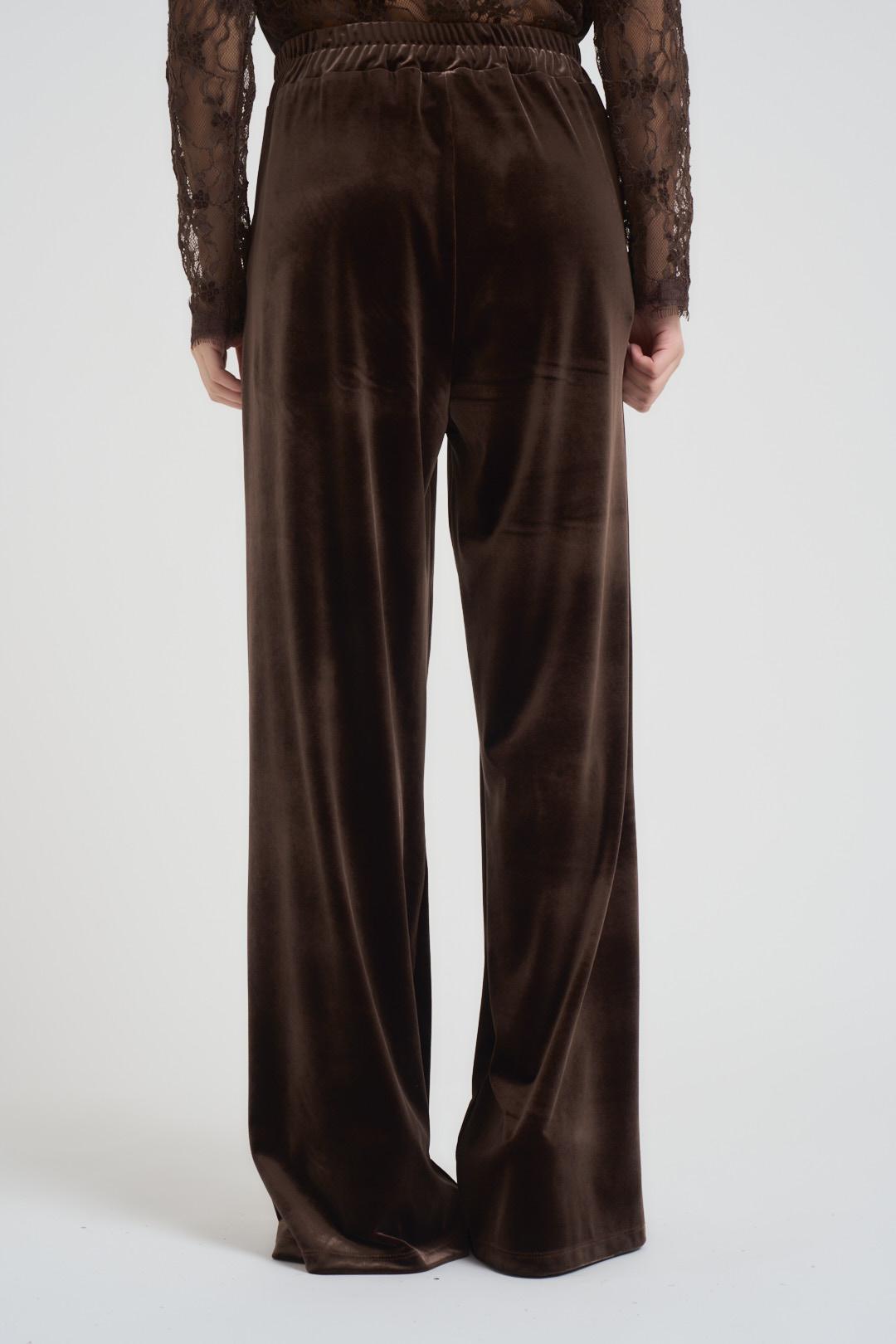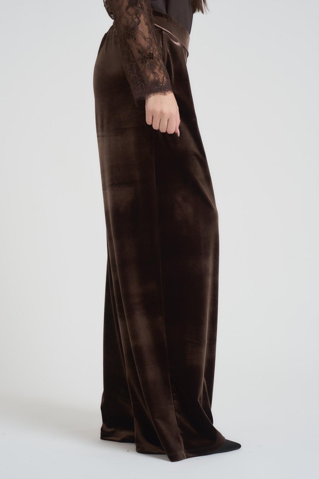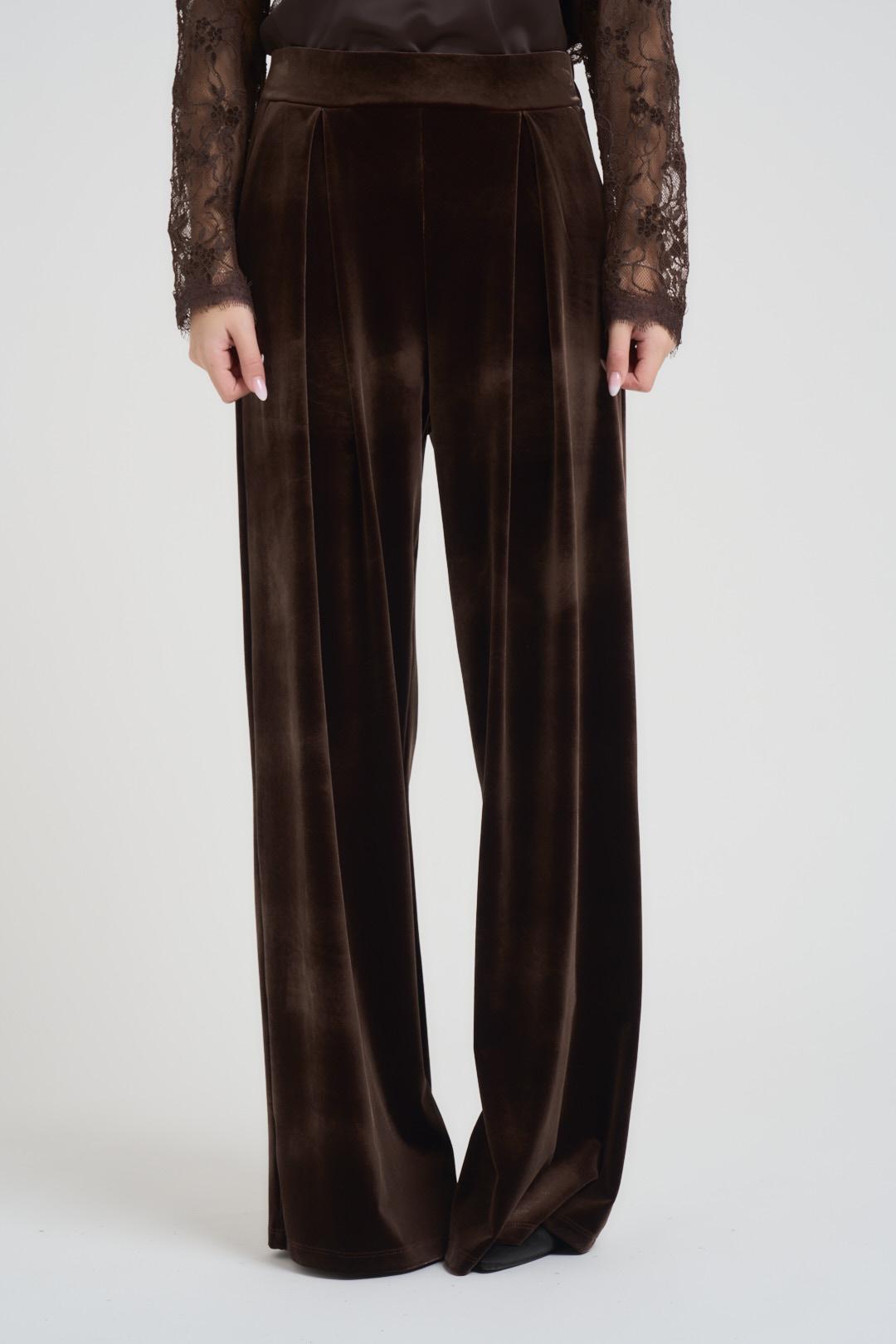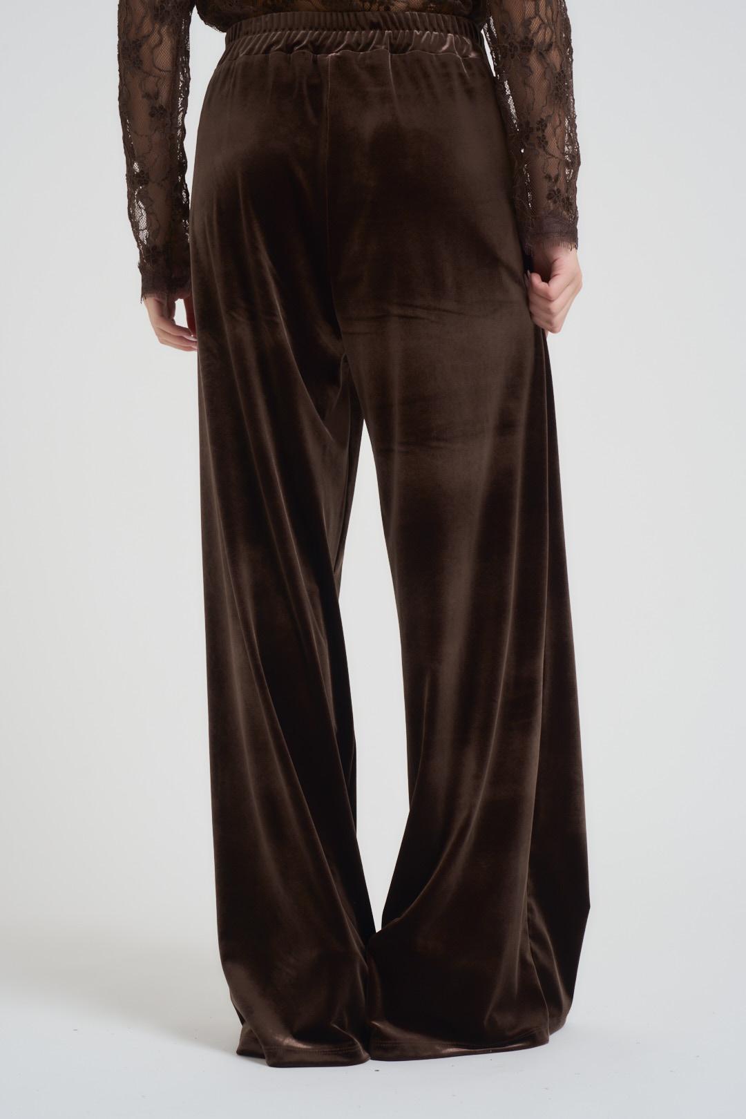 TENSIONE IN Pantalone donna a palazzo in velluto marrone. Modello con elastico in vita, due tasche a filetto. Composizione: 100% poliestere. La modella è alta 172 cm e indossa la taglia S.