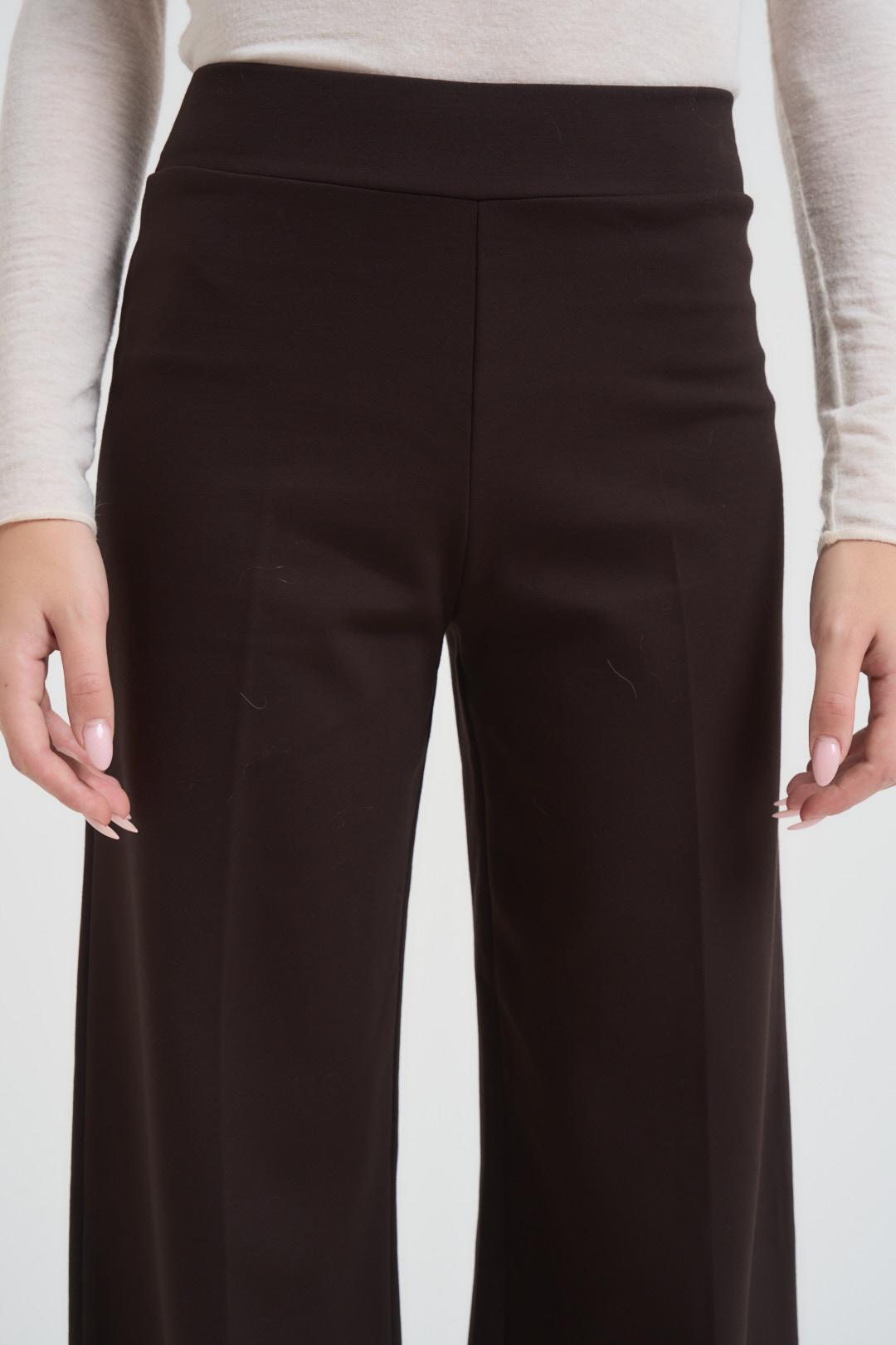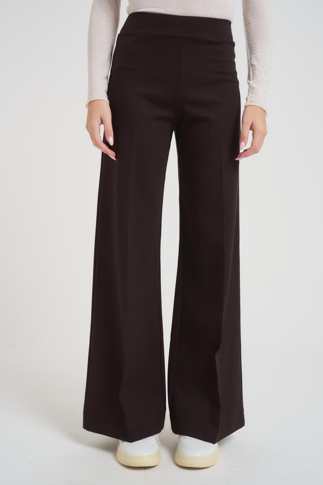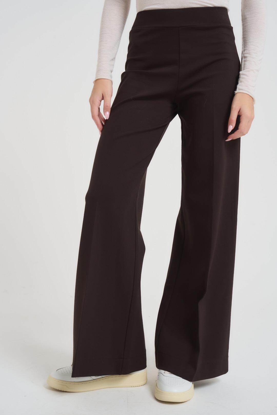 SUSY MIX Pantalone donna a palazzo marrone. Modello con gamba stretta che si allarga sul fondo. Composizione: cotone e poliestere. La modella è alta 172cm e indossa la taglia S.