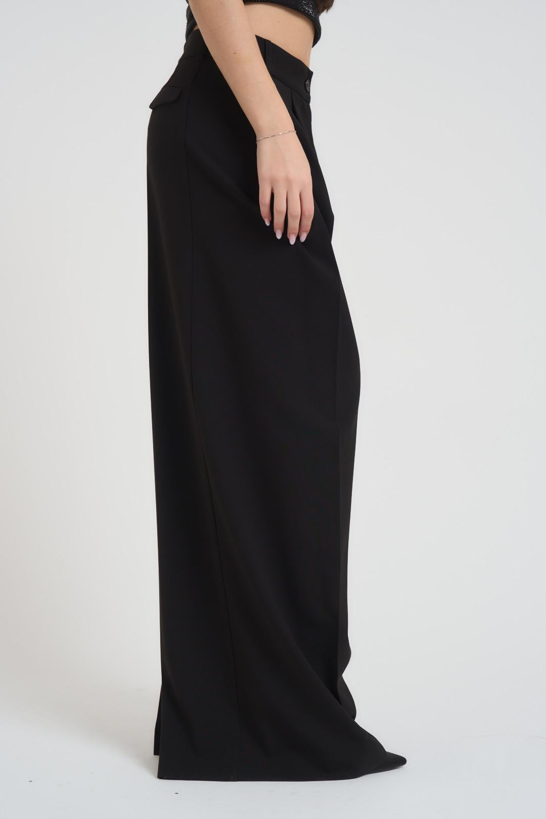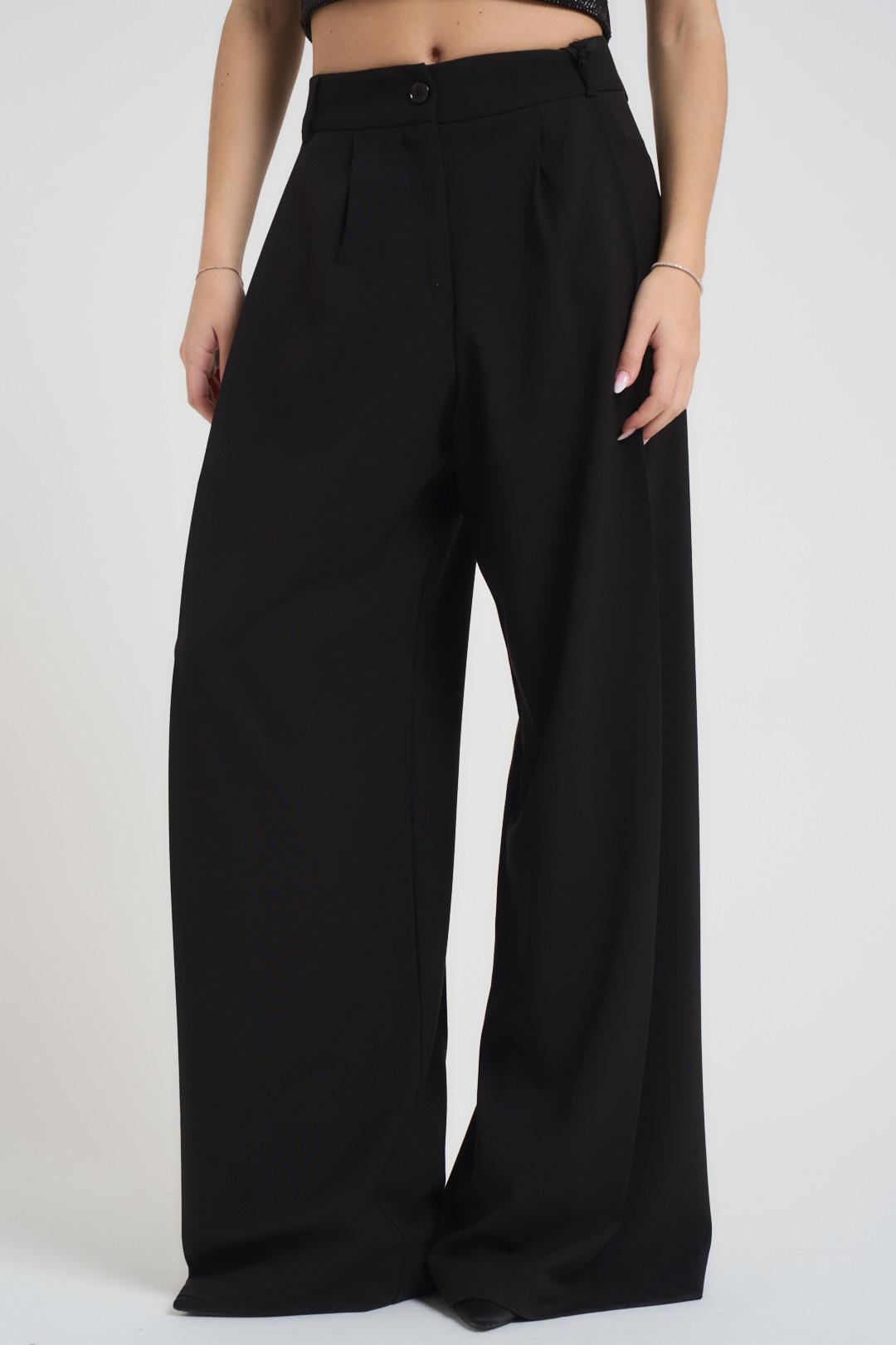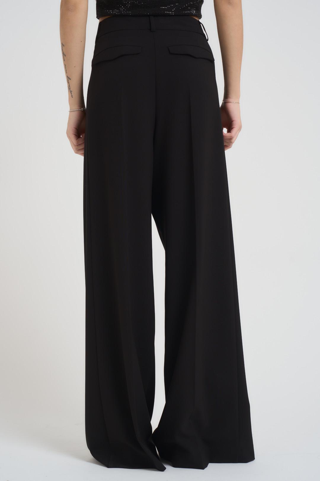 VICOLO Pantalone donna a palazzo nero. Modello gamba larga, con due tasche a filetto e a patta sul retro. Chiusura con zip e bottone. Composizione: 63% poliestere 33% viscosa 4%elastane. La modella è alta 172 cm e indossa la taglia S.