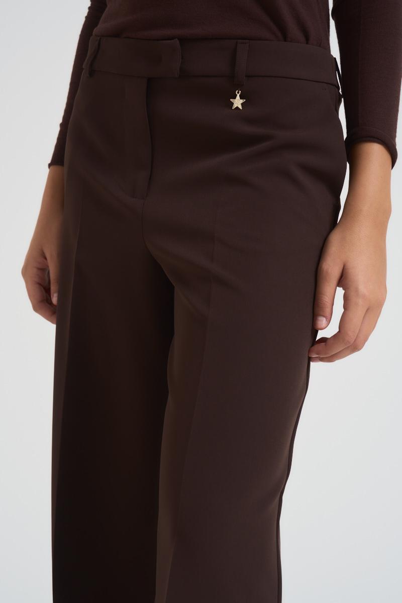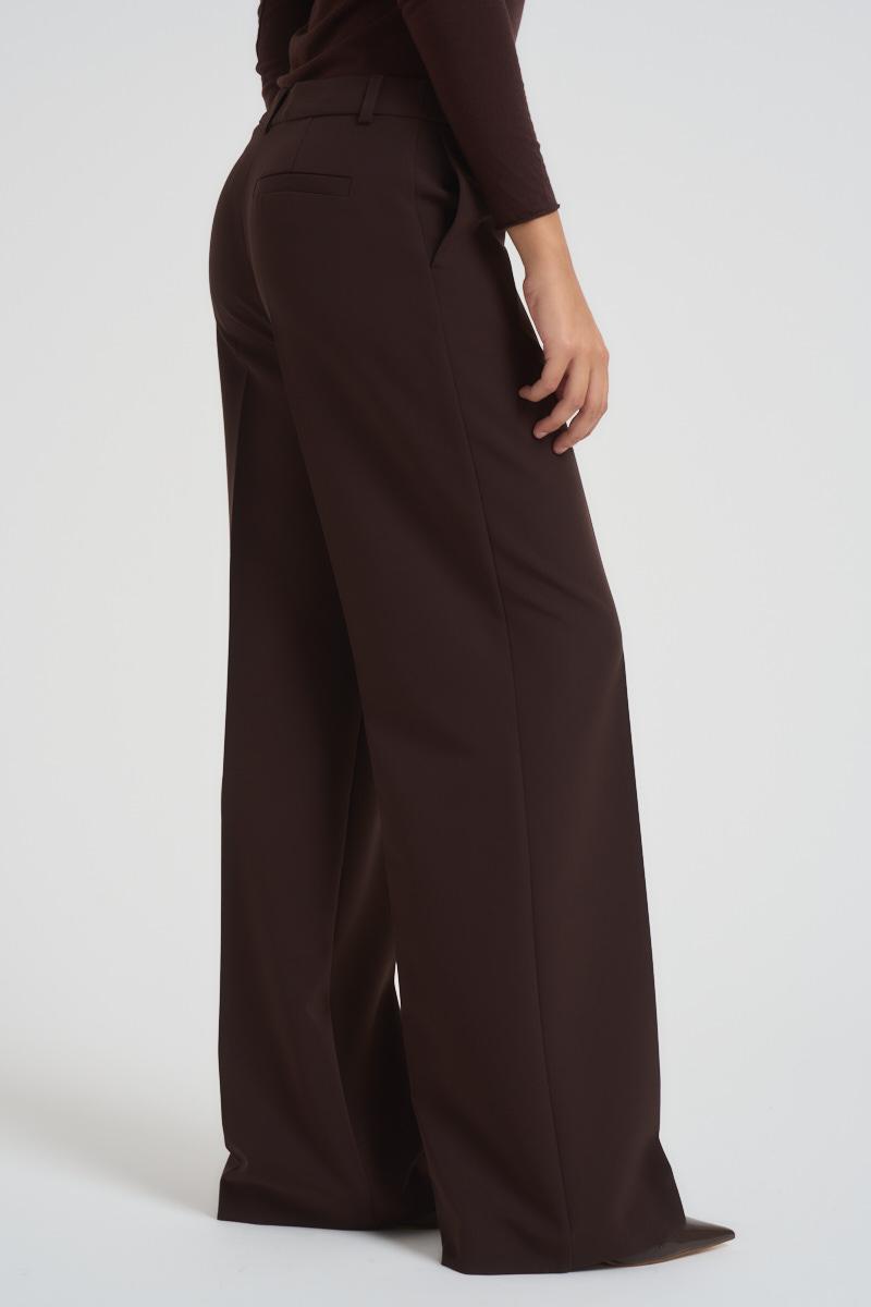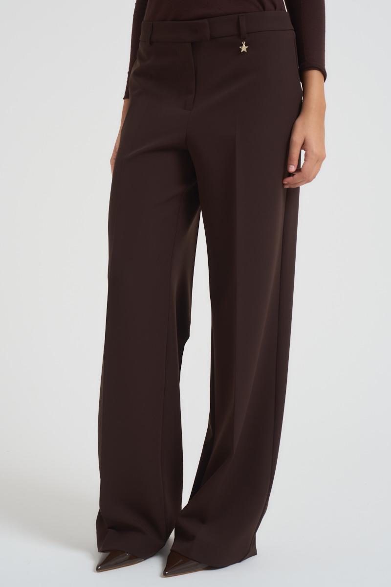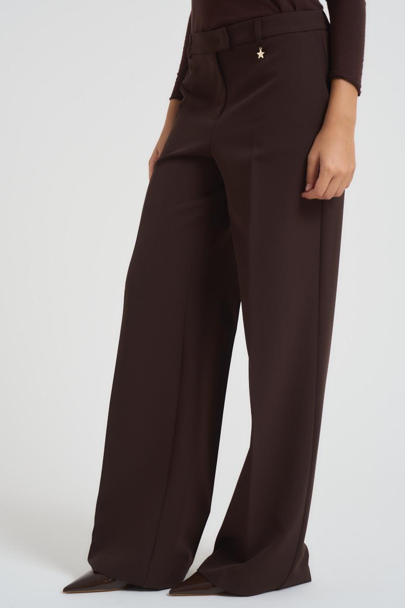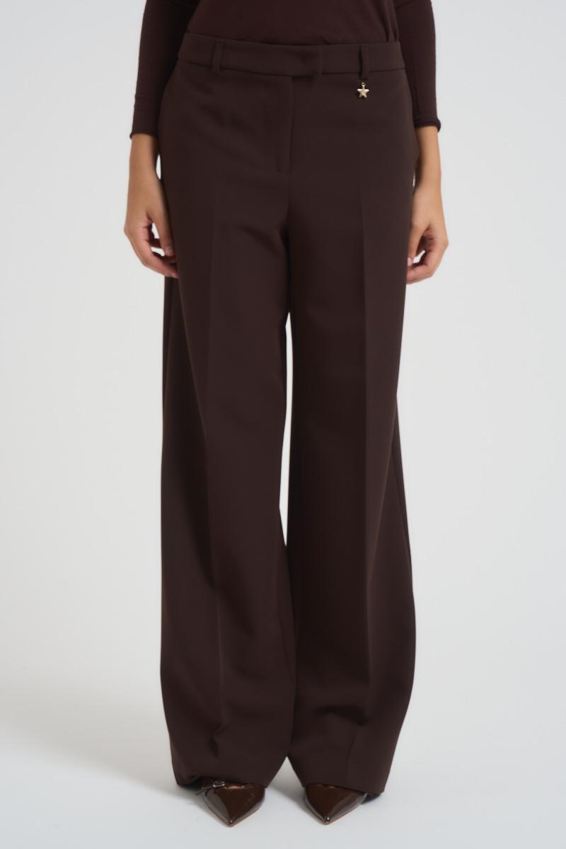 SOUVENIR CLUBBING Pantalone donna a palazzo marrone. Modello gamba dritta, passanti in vita e chiusura con zip, bottone e gancetto. Giacca abbinata venduta separatamente. Composizione: 88% poliestere 12% elastane. La modella è alta 176 cm e indossa la taglia S.