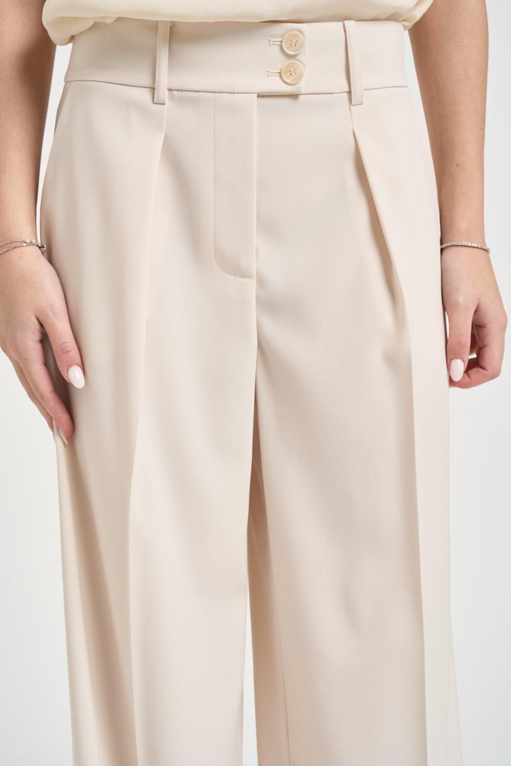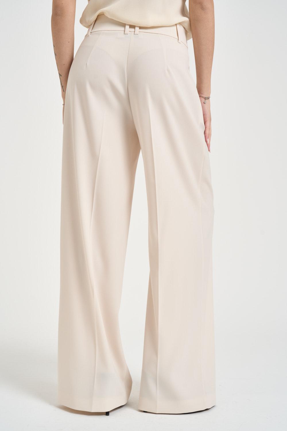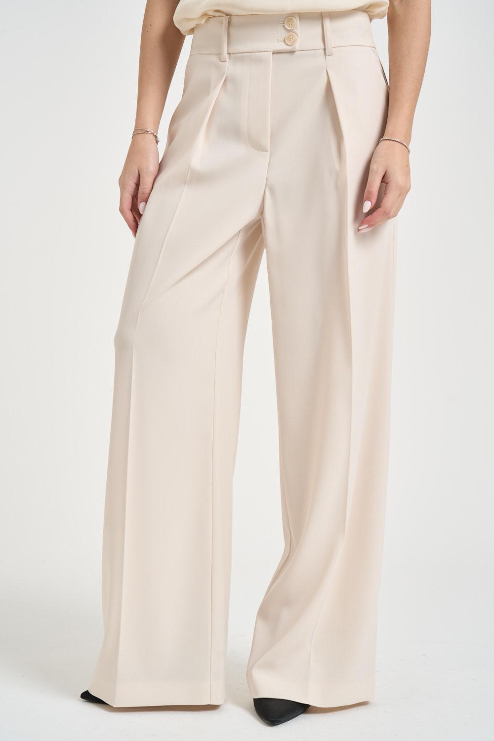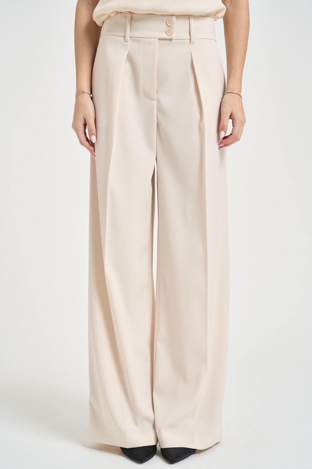 PATRIZIA PEPE Pantalone donna a palazzo panna. Modello a vita alta con linea ampia e fluida, caratterizzato da pinces frontali che valorizzano la silhouette. Chiusura frontale con zip e doppio bottone tono su tono. Passanti in vita e tasche posteriori a filetto. Design essenziale ed elegante, ideale per look raffinati da giorno o da sera. Tessuto dalla mano liscia e dalla caduta morbida. Composizione: 100% poliestere. La modella è alta 172 cm e indossa la taglia 40.