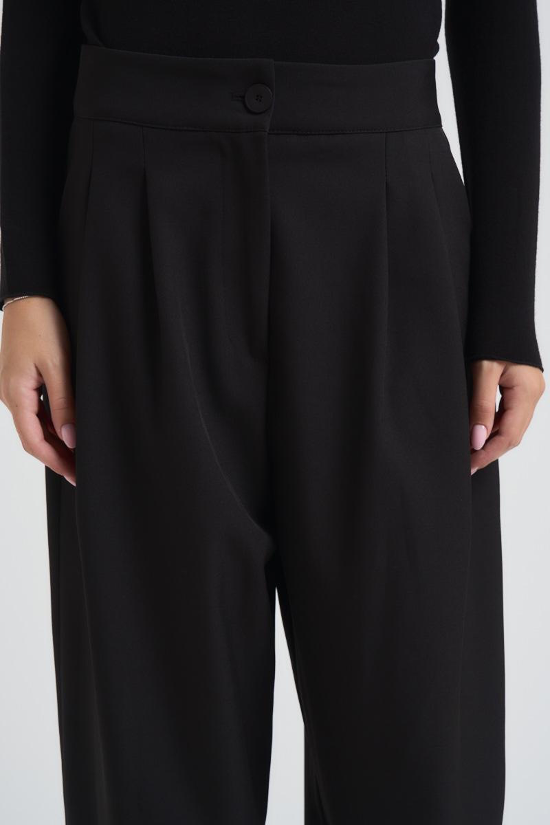VICOLO Pantalone donna balloon nero. Modello con doppia pinces, tasche laterali a filetto e chiusura con zip e bottone. Fondo con risvoltino. Vita alta e Gamba morbida. Composizione: Elastan 4% Poliestere 96%. La modella è alta 172cm e indossa la taglia S.