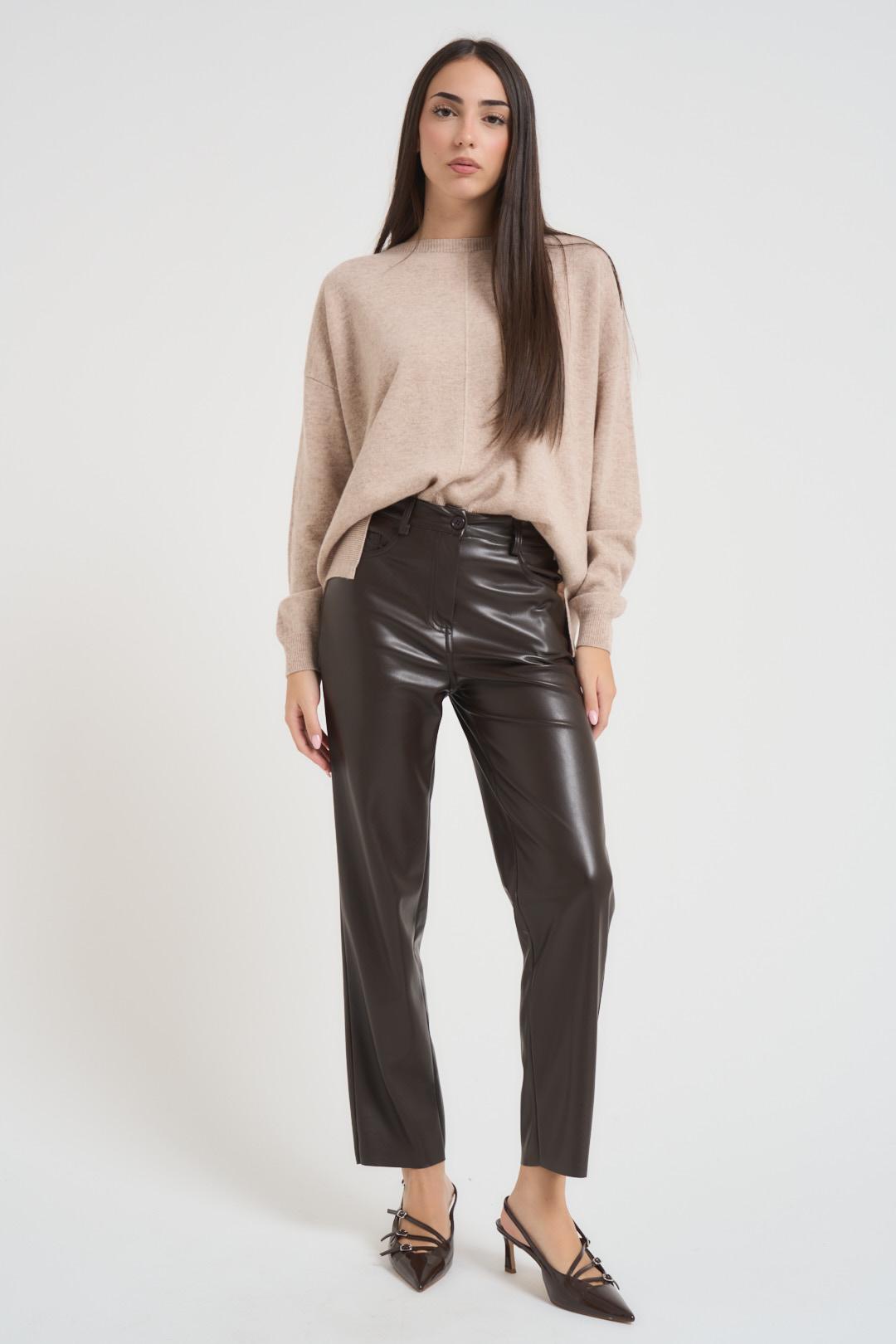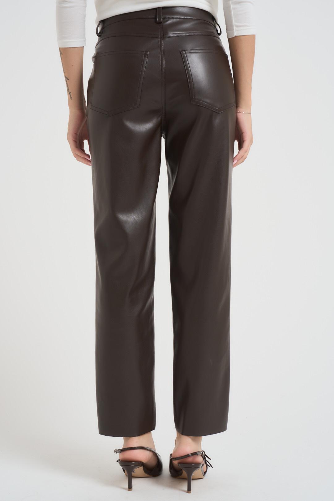 TENSIONE IN Pantalone donna in ecopelle marrone. Modello a cinque tasche, taglio vivo sul fondo, gamba dritta. Composizione: 50% Poliuretano, 50% Poliestere. La modella è alta 172cm e indossa la taglia S.