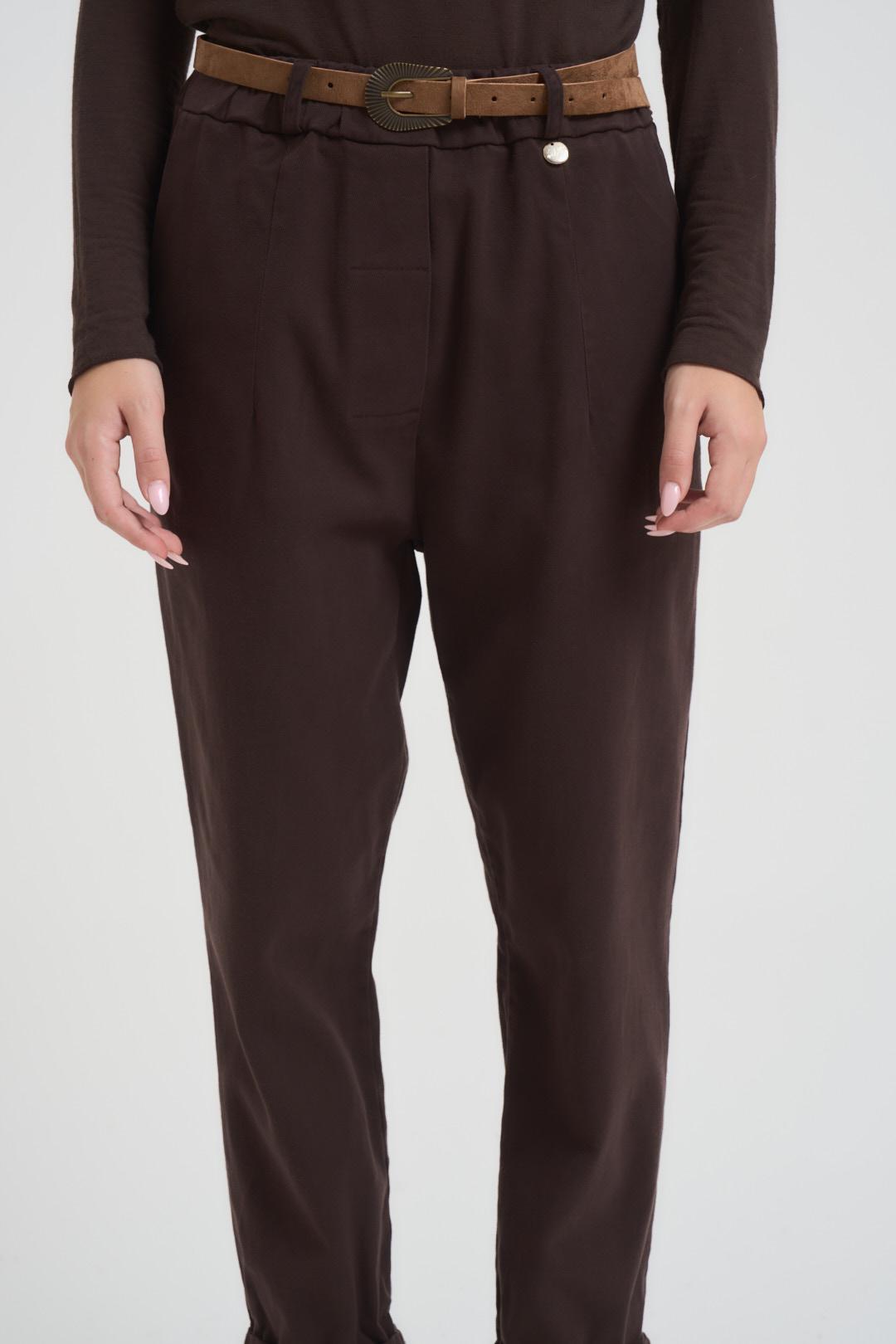 INCLOTH Pantalone donna regular marrone. Modello con lunghezza alla caviglia, elastico in vita e passanti con cintura in ecopelle cammello. Composizione: cotone. La modella è alta 172 cm e indossa la taglia S.