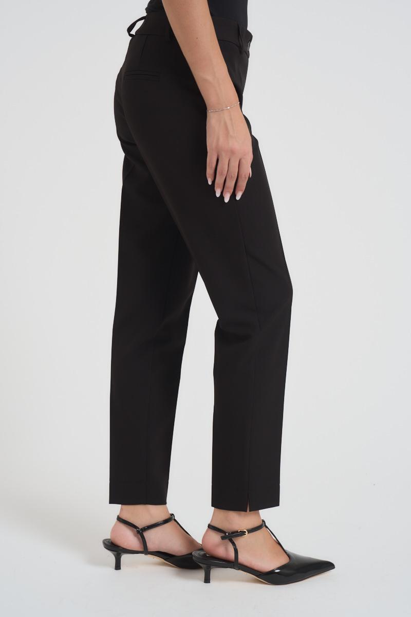 MARYLEY Pantalone donna regular nero. Modello a sigaretta, con due tasche a filetto e chiusura con zip e bottone. Composizione: 89% poliestere, 11% elastane. La modella è alta 172 cm e indossa la taglia S.