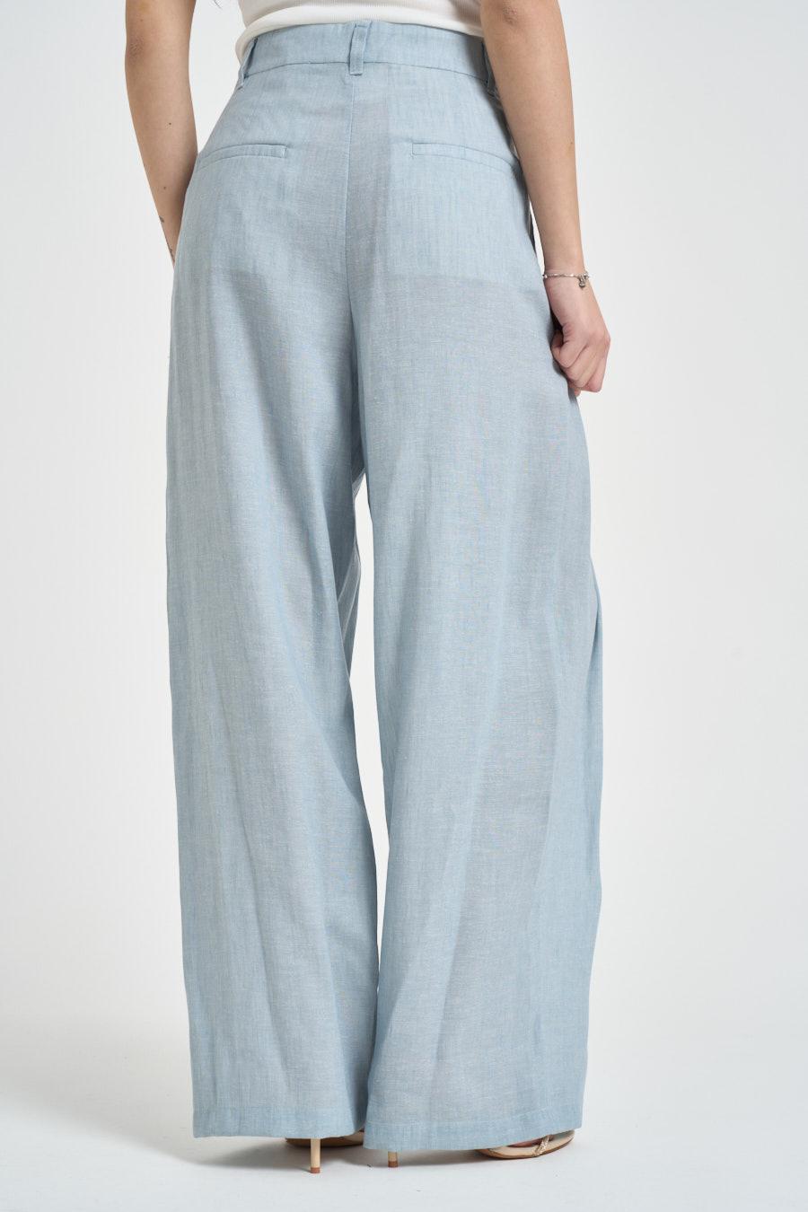 ELEH Pantalone donna wide leg celeste. Modello a vita alta con gamba ampia, pieghe frontali e chiusura con zip e bottone. Tasche laterali a filo e tasche posteriori a filetto. Composizione: 58%poliestere 32%tencel 10%lino. La modella è alta 172cm e indossa la taglia 40.