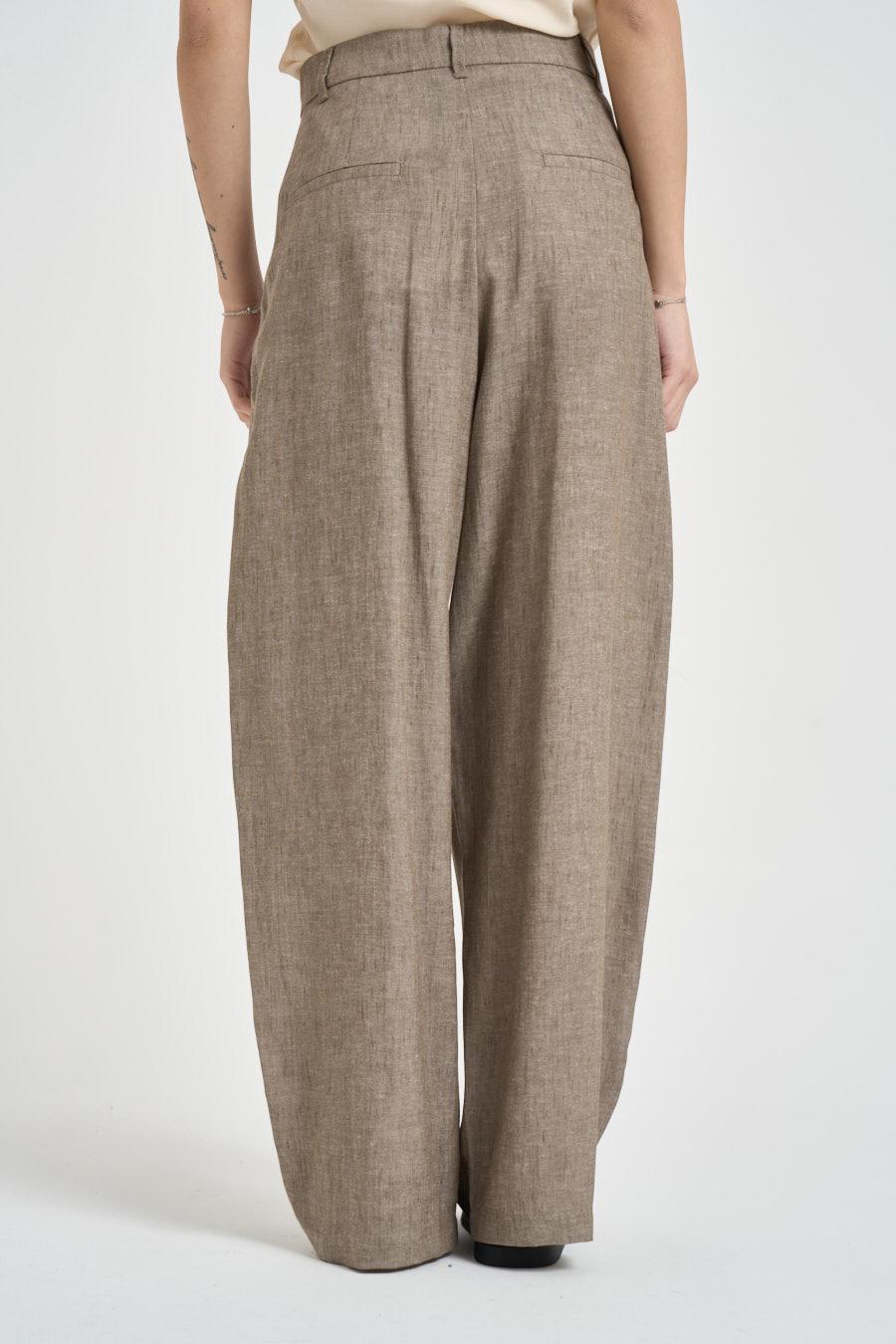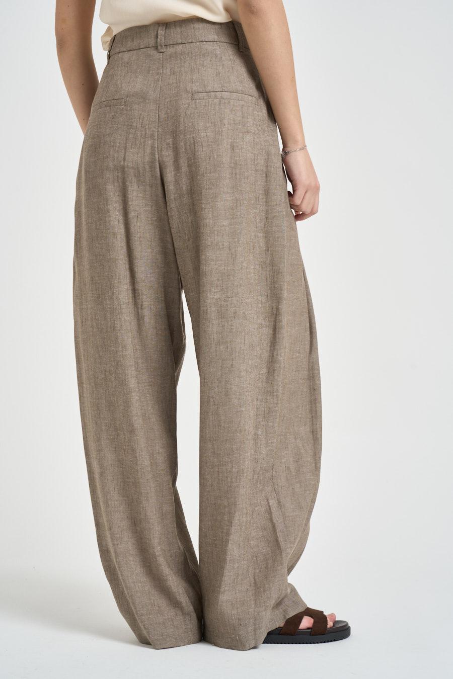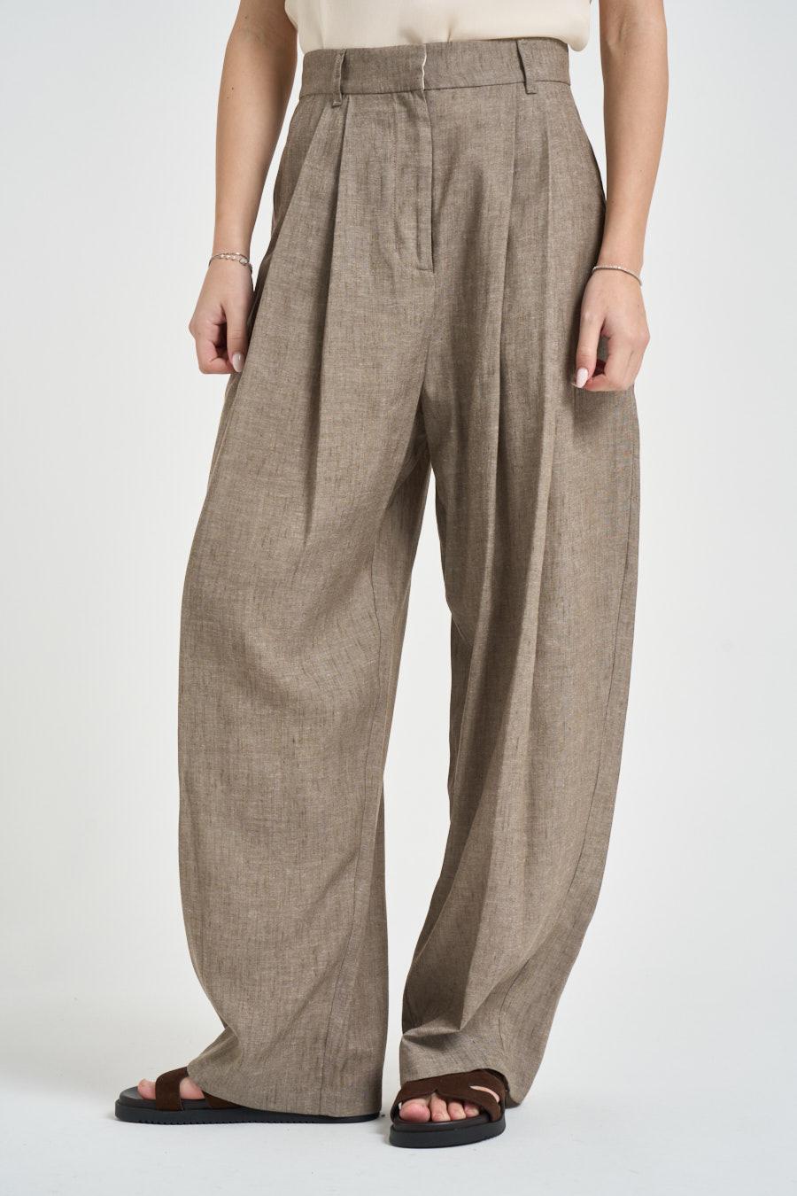 ELEH Pantalone donna wide leg tortora. Modello a vita alta con gamba ampia, pieghe frontali e chiusura con zip e bottone. Tasche laterali a filo e tasche posteriori a filetto. Composizione: 58%poliestere 32%tencel 10%lino. La modella è alta 172cm e indossa la taglia 40.