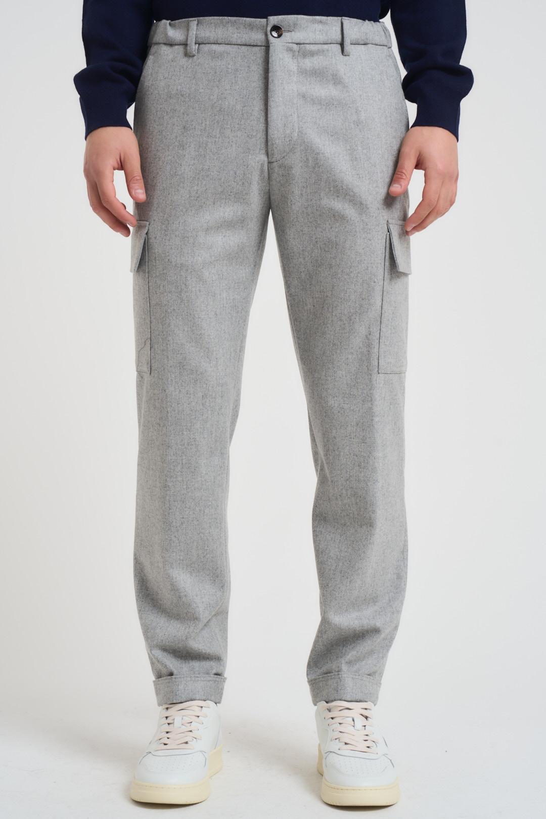 MICHAEL COAL Pantalone uomo cargo grigio chiaro. Modello con vita elasticizzata e coulisse interna, chiusura con bottone e zip a scomparsa. Tasche frontali e a patta laterali, tasche con bottone sul retro. Risvolti cuciti in fondo, passanti per cintura. Composizione: 100% lana vergine. Il modello è alto 190cm e indossa la taglia 32.