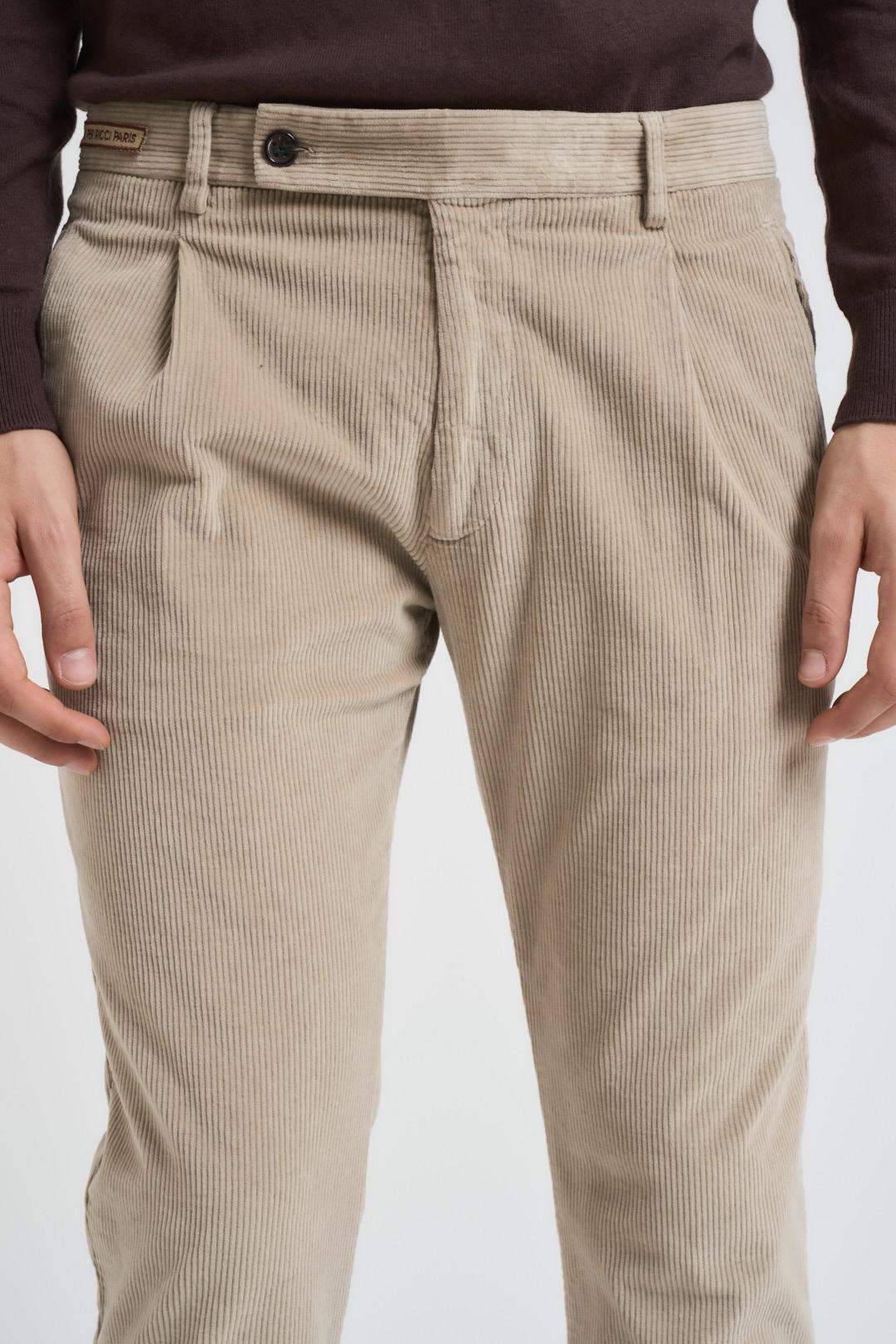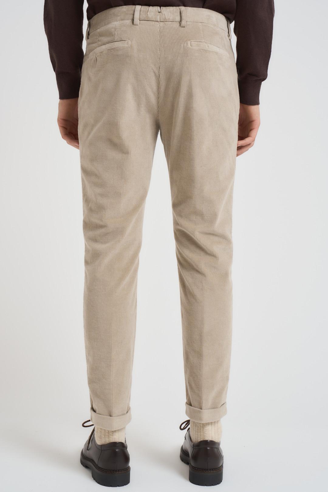 BERWICH Pantalone uomo con pence in velluto a coste tortora. Tasche anteriori oblique a filetto e posteriori orizzontali a filetto. Chiusura con zip e bottone. Composizione 100% cotone. Il modello è alto 190 cm e indossa la taglia 50.
