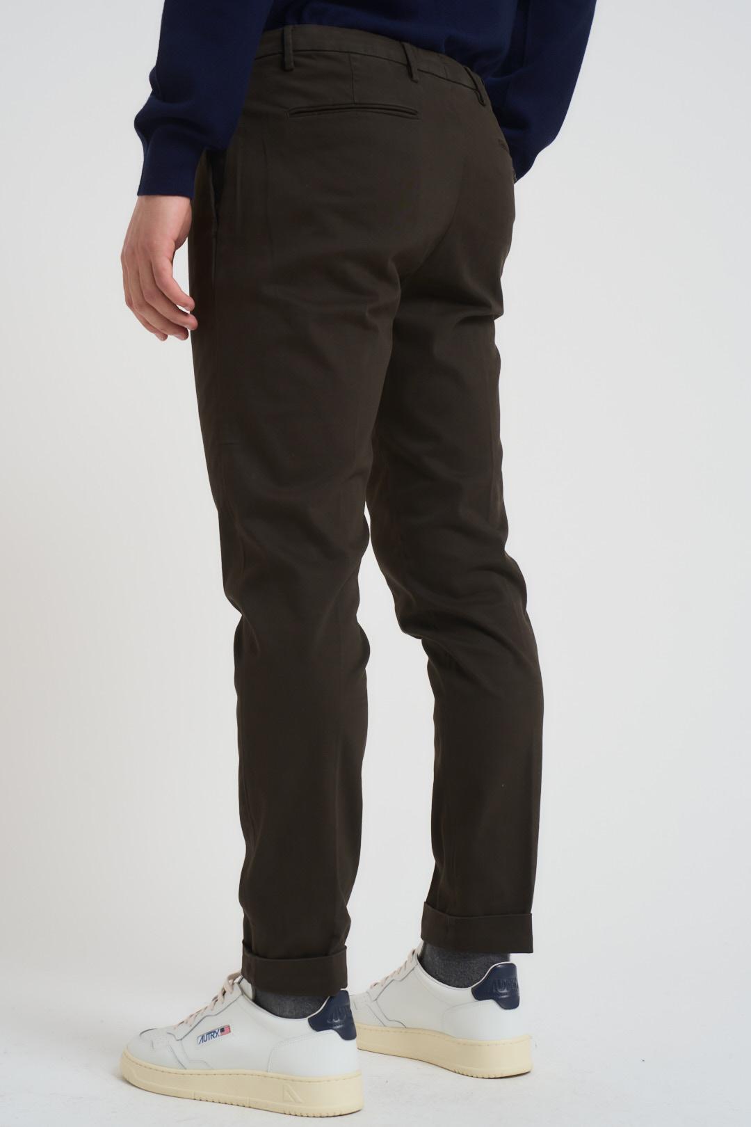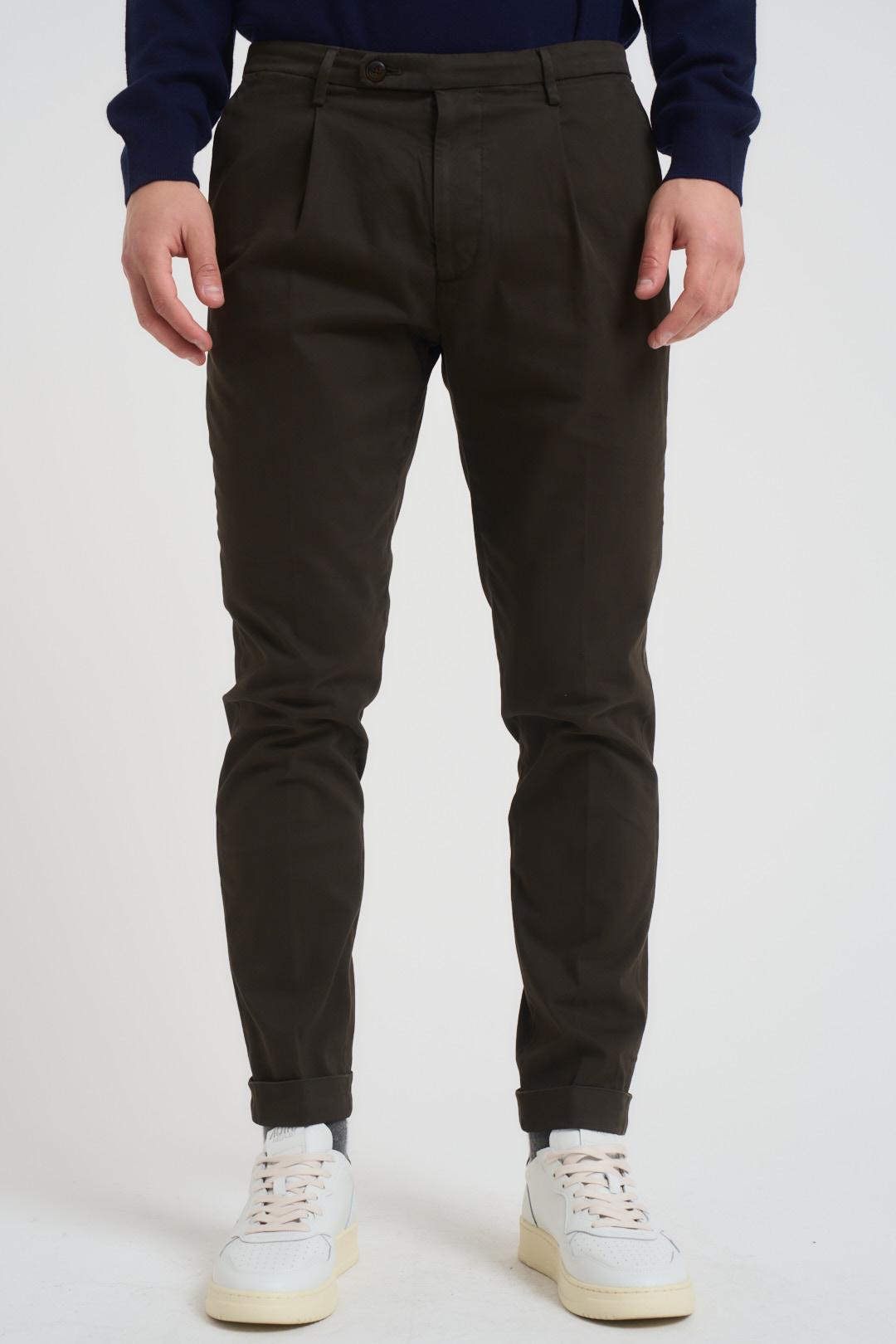 MICHAEL COAL Pantalone uomo con pinces marrone. Modello con pinces, chiusura con zip e bottone. Tasche a filetto. Composizione: 97% cotone 3% elastane. Il modello è alto 190cm e indossa la taglia L.