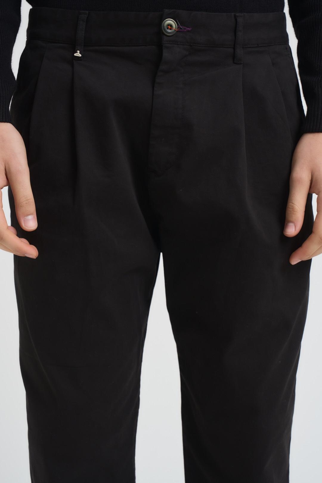 BERNA Pantalone uomo con pinces nero.Modello con tasche americane sul fronte ed a filetto nel retro, etichetta logo in vita. Chiusura centrale con bottone decorato e zip nascosta. Composizione: 97% Cotone 3% Elastane. Il modello è alto 190cm e indossa la taglia 48.