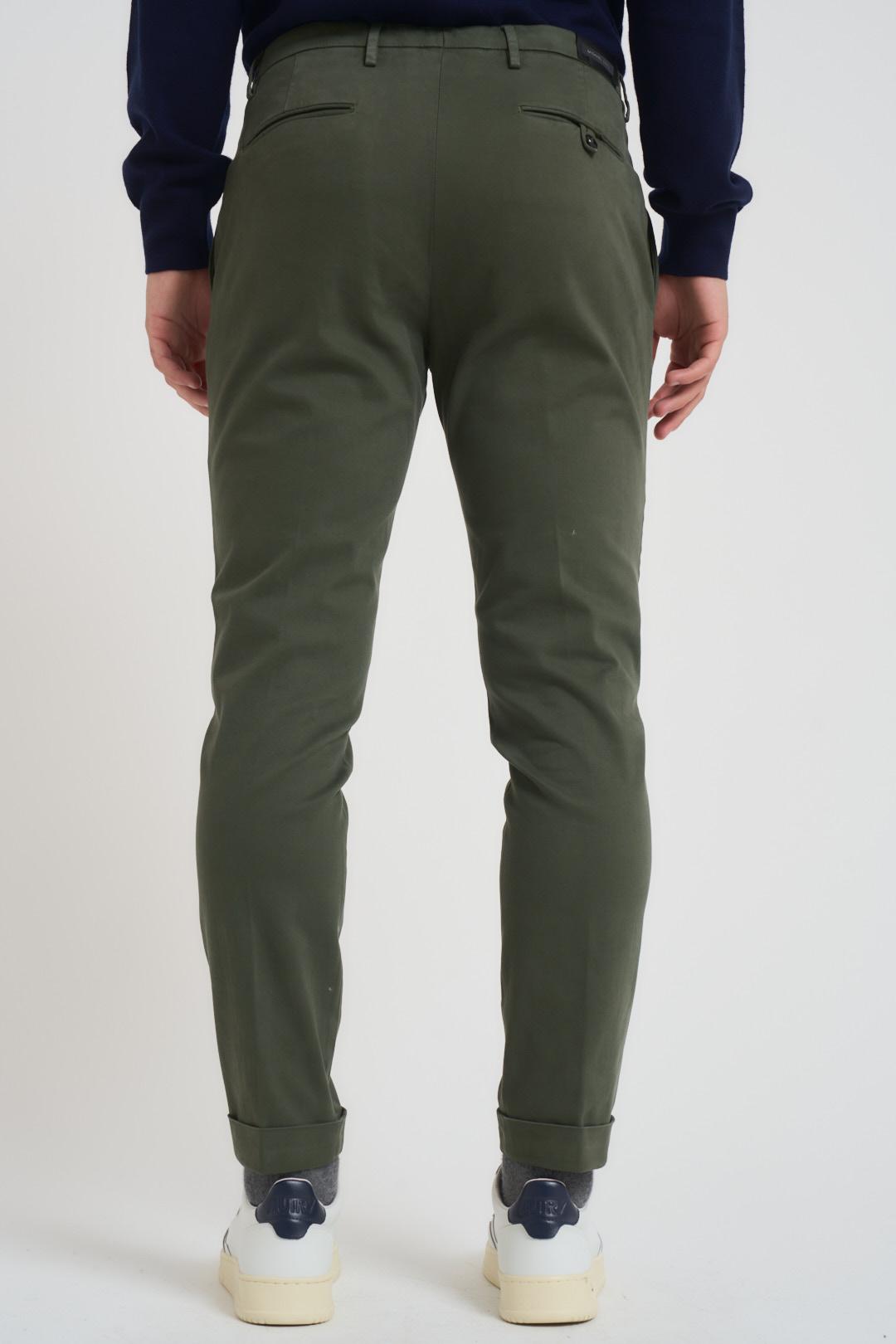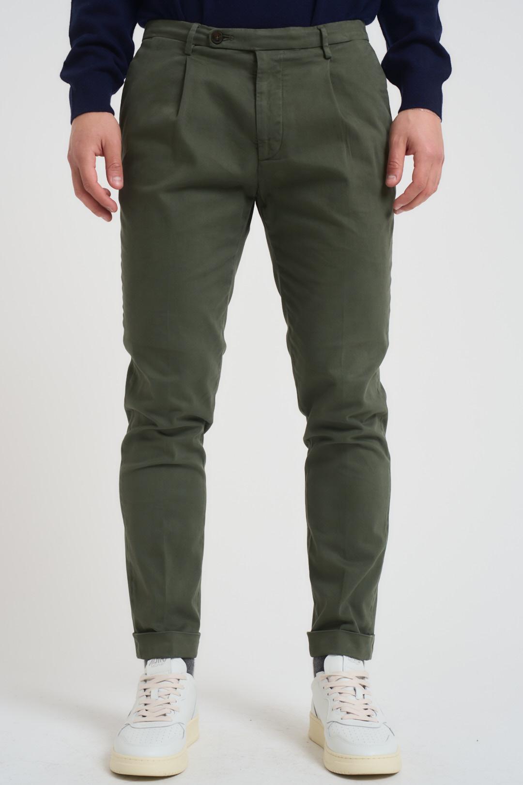 MICHAEL COAL Pantalone uomo con pinces verde militare. Modello con pinces, chiusura con zip e bottone. Tasche a filetto. Composizione: 97% cotone 3% elastane. Il modello è alto 190cm e indossa la taglia L.
