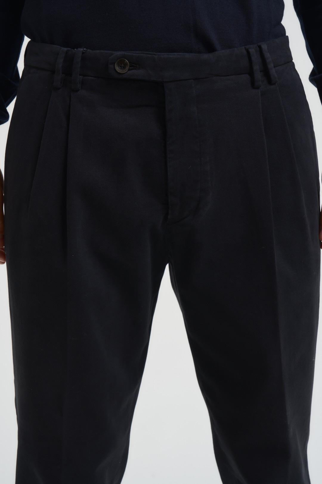 MICHAEL COAL Pantalone uomo dritto blu scuro. Modello lunghezza alla caviglia. Chiusura con zip e bottone. Passanti in vita. Tasche laterali. Tasche sul retro con patta. Doppia piences e pieghe. Composizione: 52% lana, 43% poliestere, 5% elastane. Il modello è alto 190 cm e indossa la taglia 32.