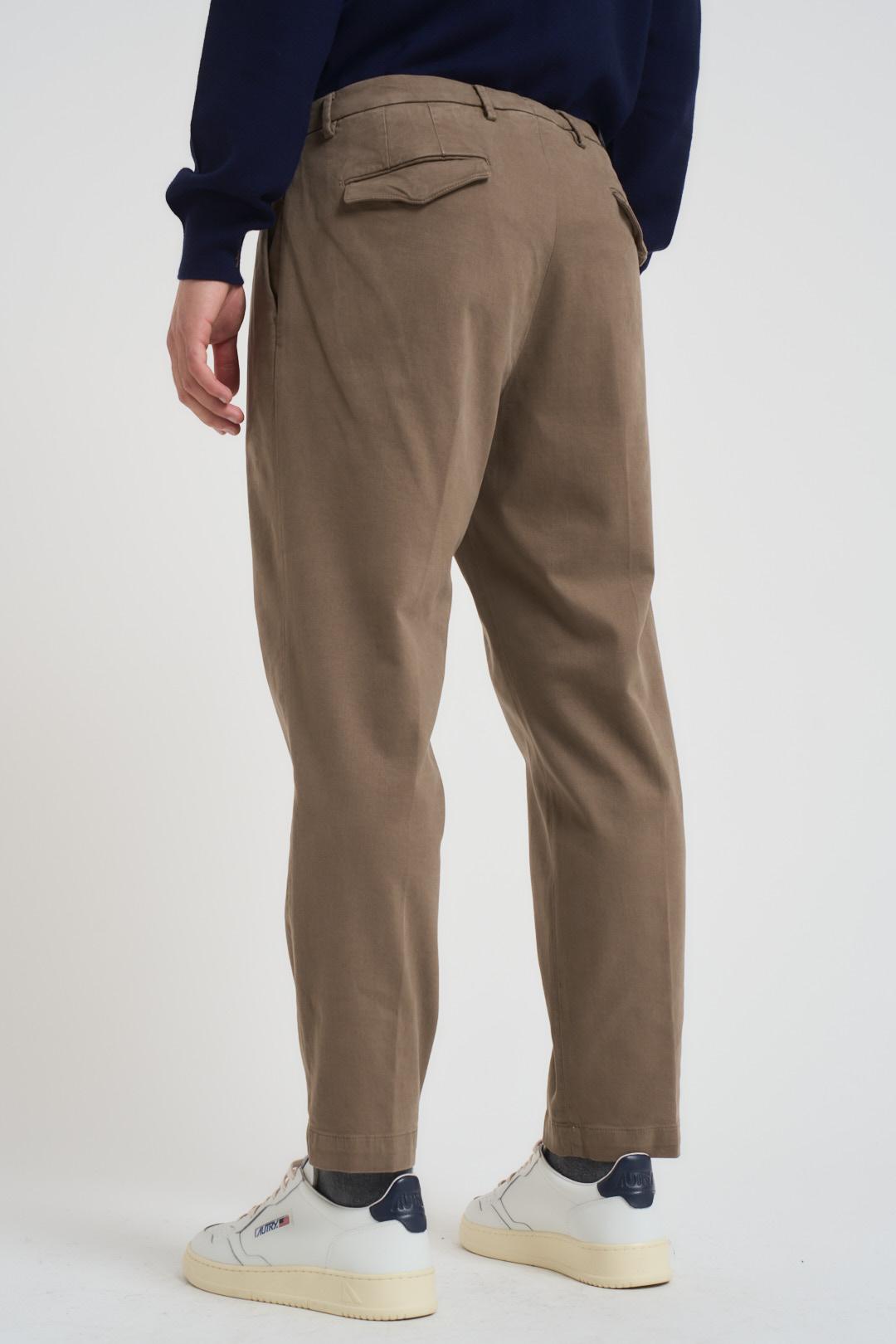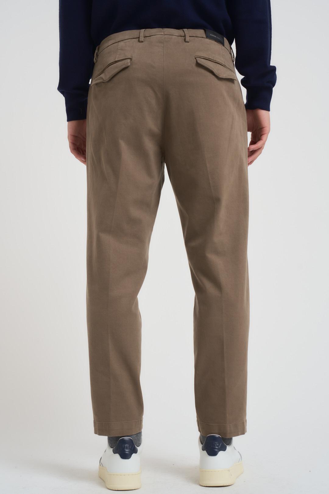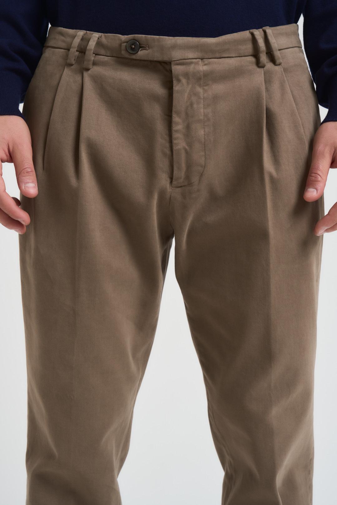MICHAEL COAL Pantalone uomo dritto fango. Modello lunghezza alla caviglia. Chiusura con zip e bottone. Passanti in vita. Tasche laterali. Tasche sul retro con patta. Doppia piences e pieghe. Composizione: 52% lana, 43% poliestere, 5% elastane. Il modello è alto 190 cm e indossa la taglia 32.