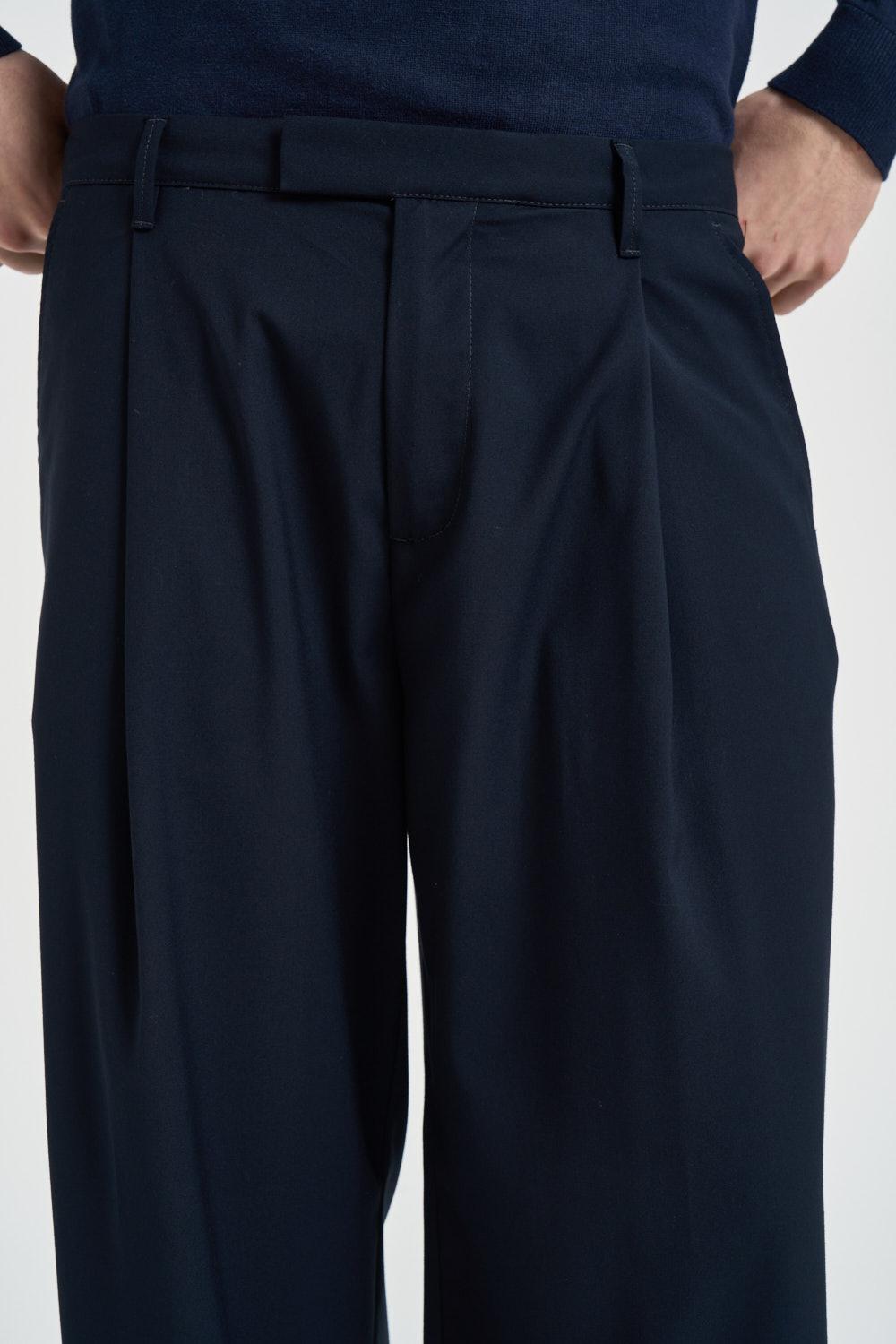 ALTA TENSIONE Pantalone uomo gamba ampia blu. Modello dalla vestibilità morbida. Chiusura frontale con cerniera e bottone. Passanti in vita. Tasche laterali. Tasche a filo sul retro. Composizione: 69% poliestere, 29% viscosa, 2% elastane. Il modello è alto 190cm e indossa la taglia 50.