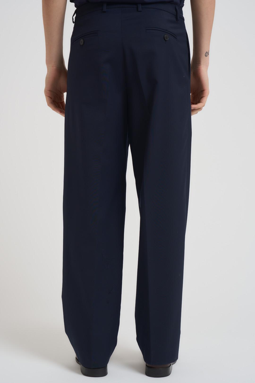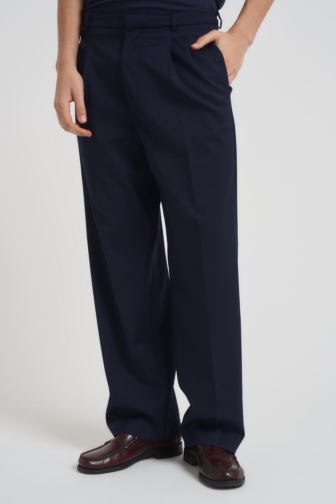 AMARANTO Pantalone uomo gamba dritta blu. Modello con doppia pinces, passanti in vita e chiusura con zip e gancio. Tasche a filetto sul fianco e tasche con bottone nella parte posteriore. Composizione: 54% Poliestere, 44% Lana, 2% Elastan. Il modello è alto 190cm e indossa la taglia 48.