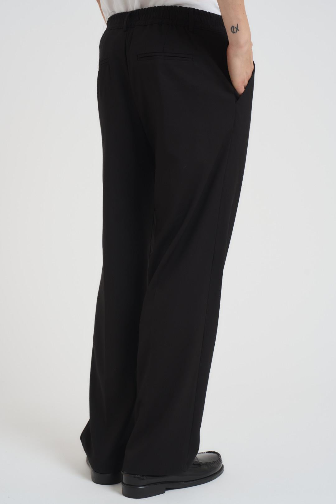 MAIN DELUXE Pantalone uomo gamba dritta nero. Modello con passanti in vita, chiusura con zip e bottone. Due tasche a filetto. Composizione: cotone e poliestere. Il modello è alto 190cm e indossa la taglia 50.
