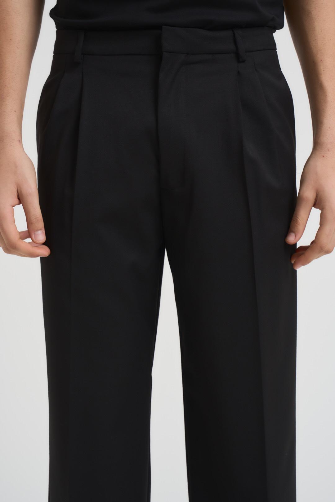 AMARANTO Pantalone uomo gamba dritta nero. Modello con doppia pinces, passanti in vita e chiusura con zip e gancio. Tasche a filetto sul fianco e tasche con bottone nella parte posteriore. Composizione: 54% Poliestere, 44% Lana, 2% Elastan. Il modello è alto 190cm e indossa la taglia 48.