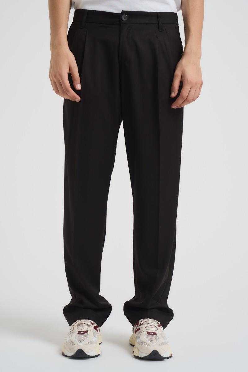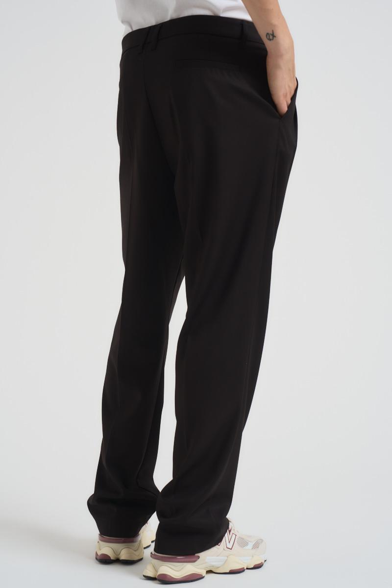 IMPERIAL Pantalone uomo gamba dritta nero. Modello con zip e bottone, tasca laterale a filetto. Composizione: 63% Poliestere 34% Viscosa 3% Elastan. Il modello è alto 190 cm e indossa la taglia 46.