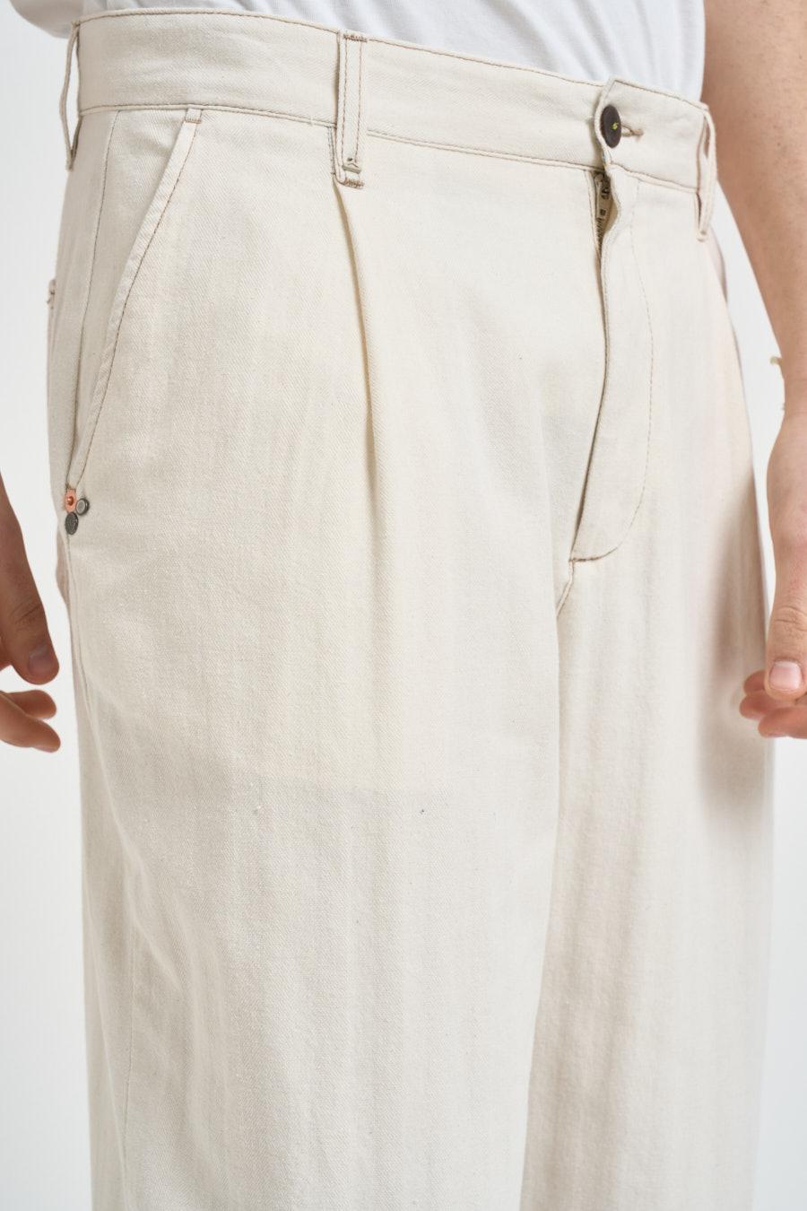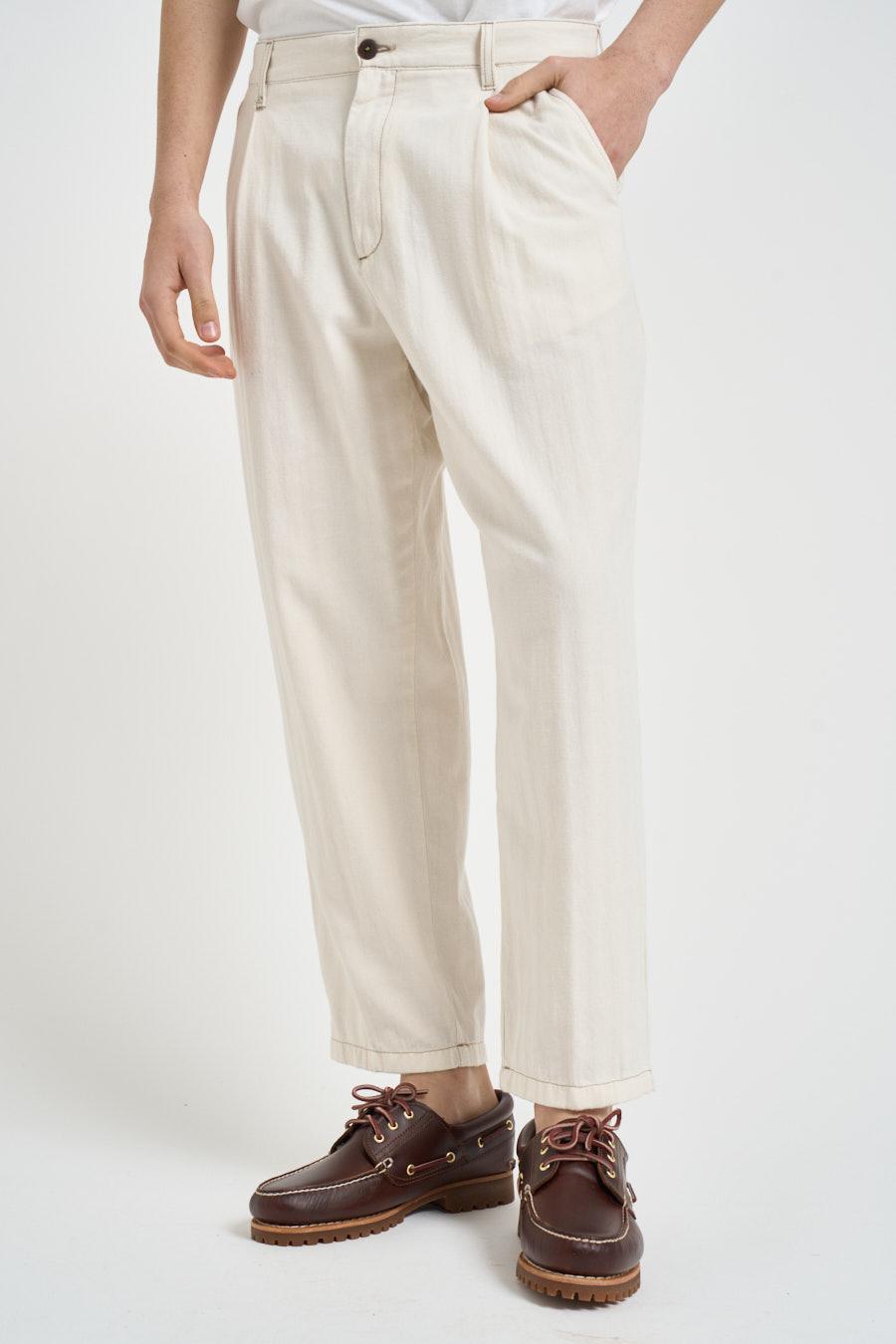 BERNA Pantalone uomo regular avorio. Modello con vita regolare e passanti per cintura, chiusura frontale con bottone e zip nascosta. Linea morbida con gamba dritta e lunghezza alla caviglia, arricchita da tasche laterali e tasche posteriori applicate. Composizione: 74% cotone 26% poliestere. Il modello è alto 190cm e indossa la taglia 50.