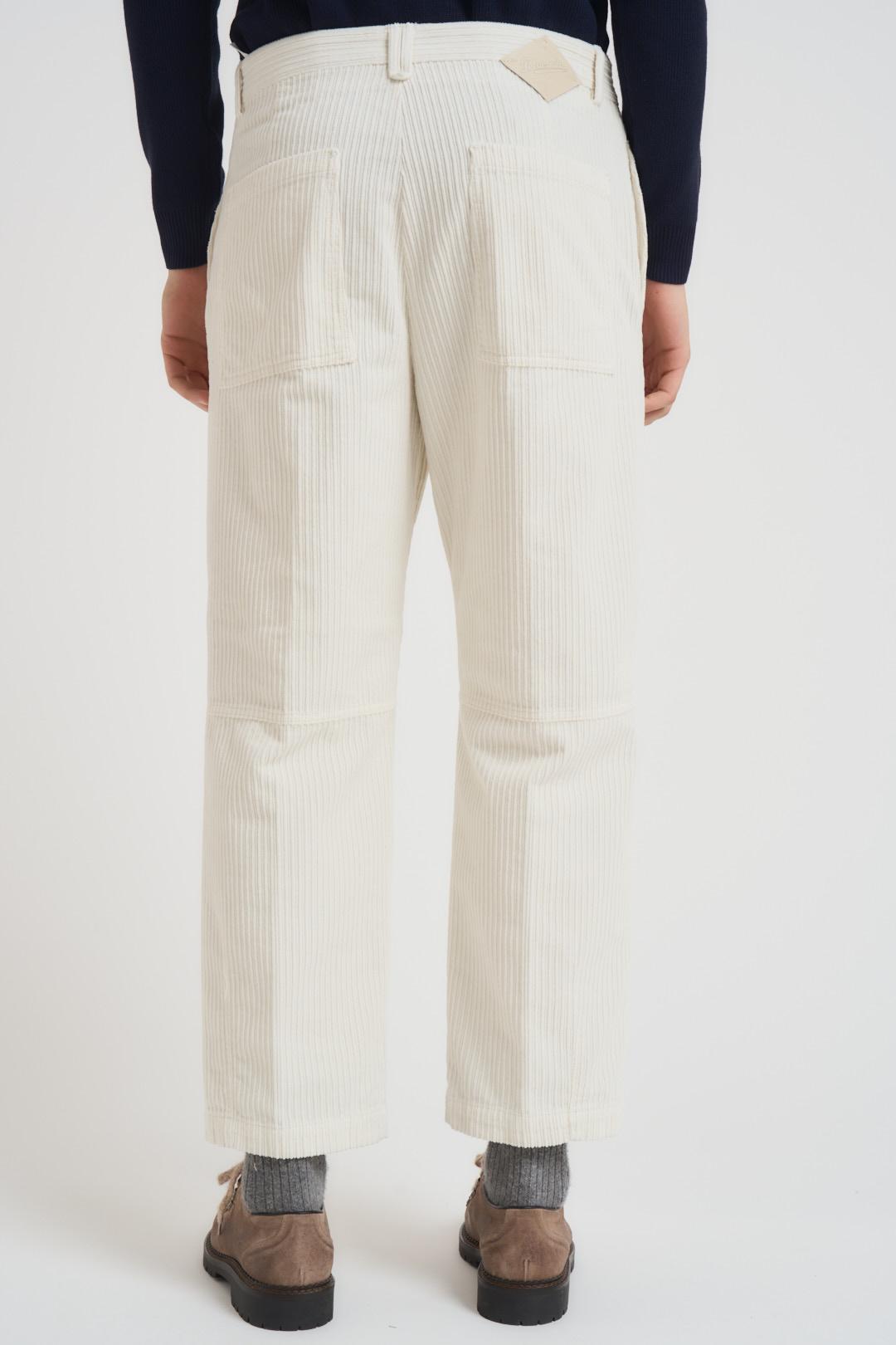 TELACRUDA Pantalone uomo regular fit a costine panna. Modello con due tasche a filetto, chiusura con zip e bottone. Passanti in vita e duetasche a patta sul retro. Composizione: 98% cotone 2% elastane. Il modello è alto 190cm e indossa la taglia 32.