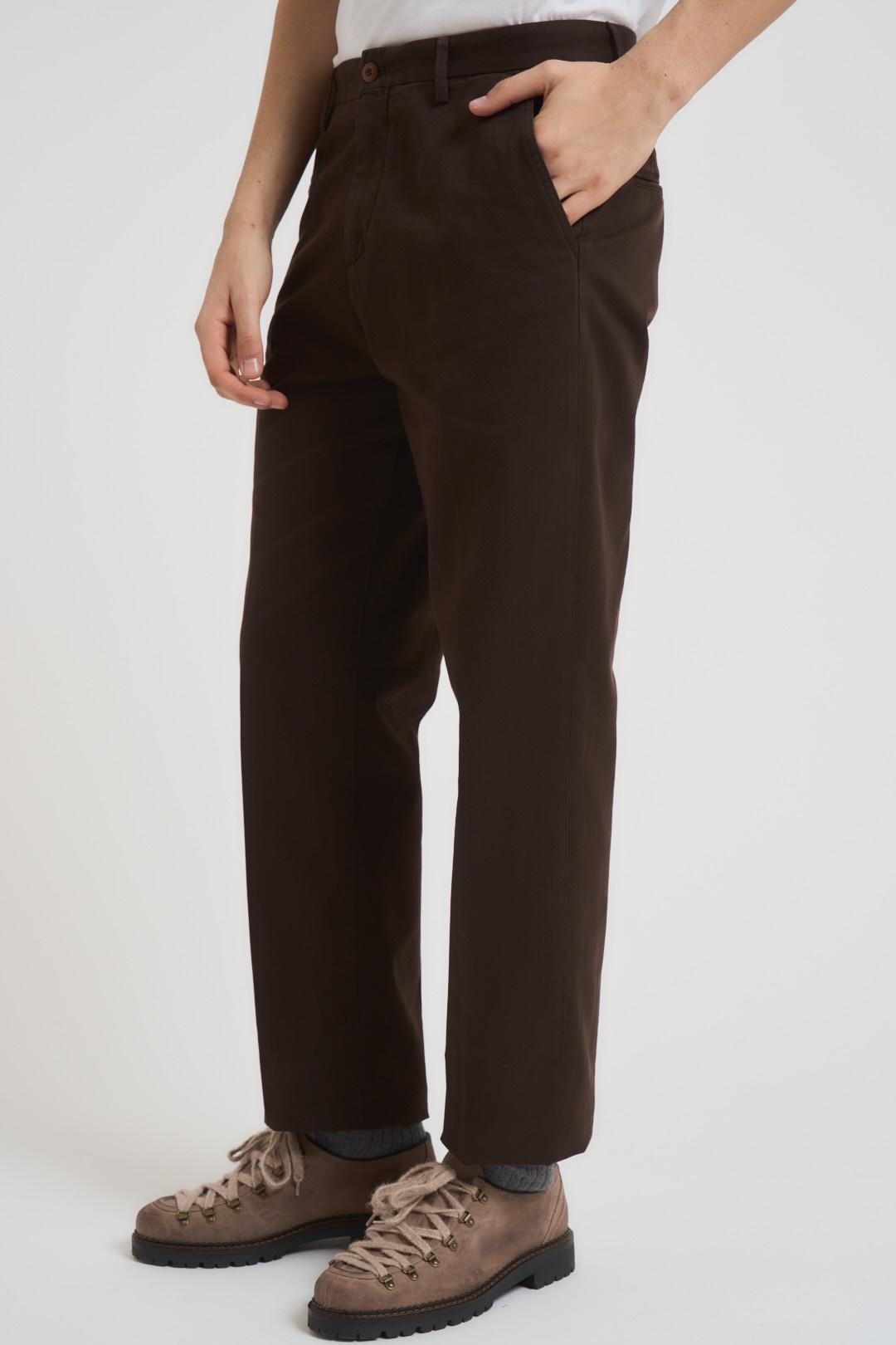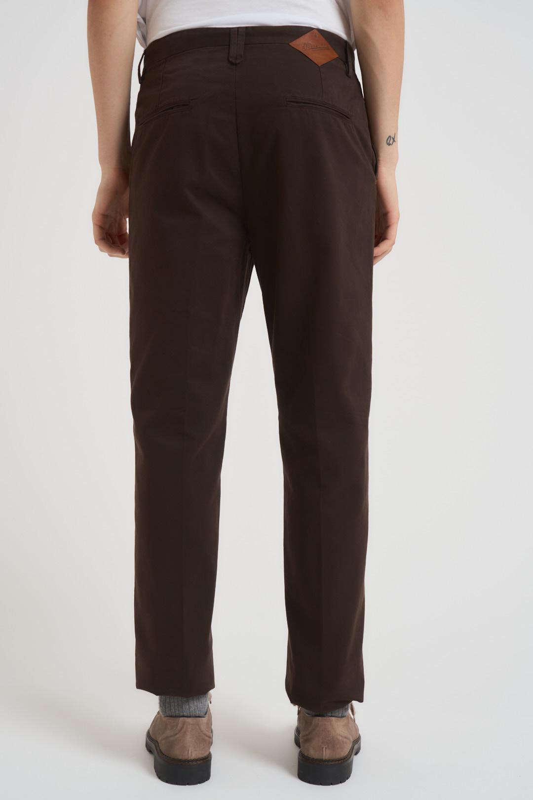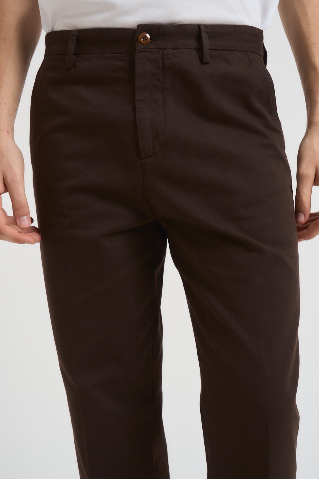 TELACRUDA Pantalone uomo regular marrone. Modello con gamba dritta, due tasche a filetto, passanti in vita, chiusura con zip e bottone. Composizione: 100% cotone. Il modello è alto 190cm e indossa la taglia 32.