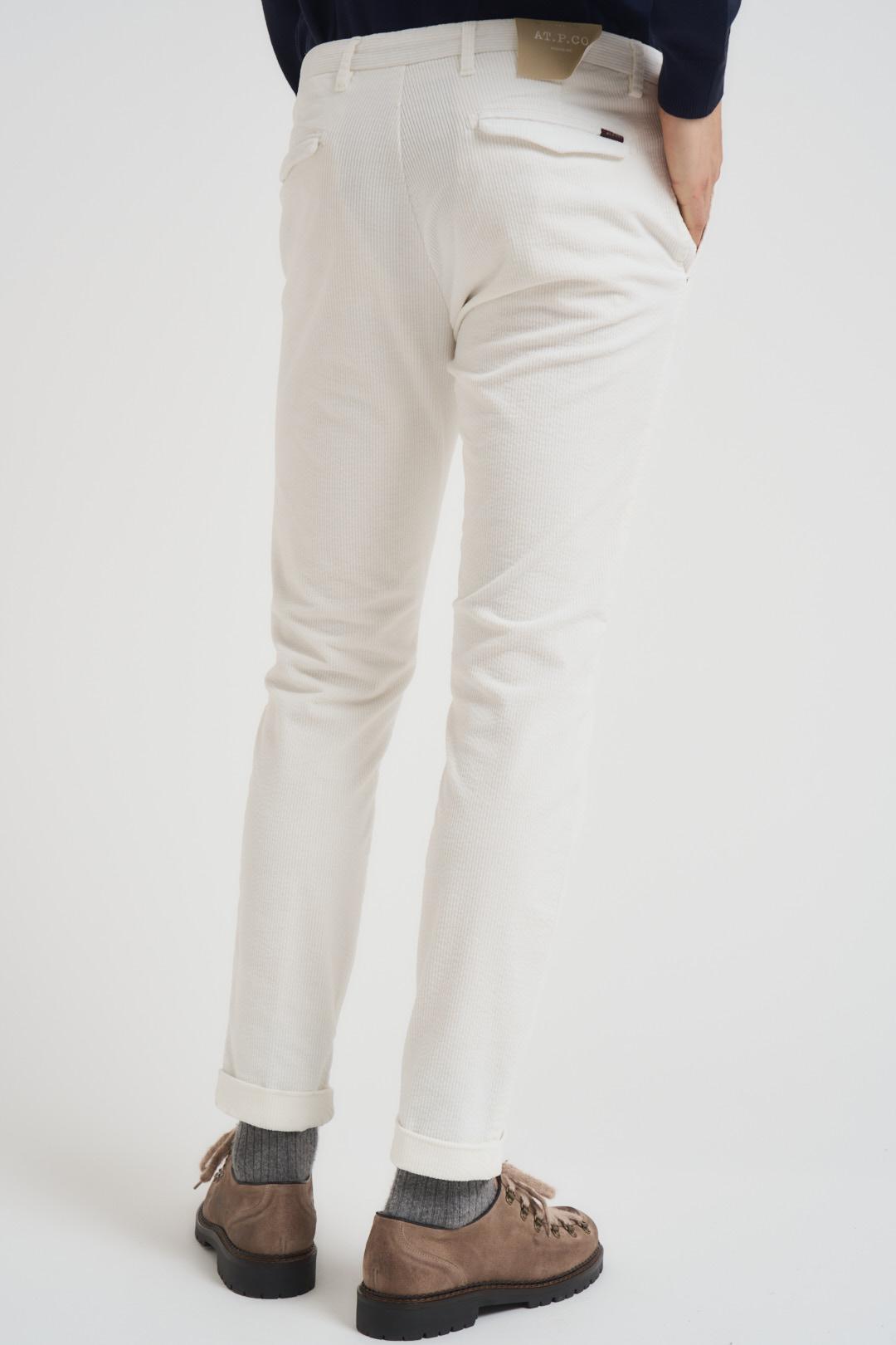 AT.P.CO Pantalone uomo skinny a costine panna. Modello gamba stretta, due tasche a filetto laterali e passanti in vita. Chiusura con zip e bottone. Composizione: misto cotone. Il modello è alto 190cm e indossa la taglia 50.