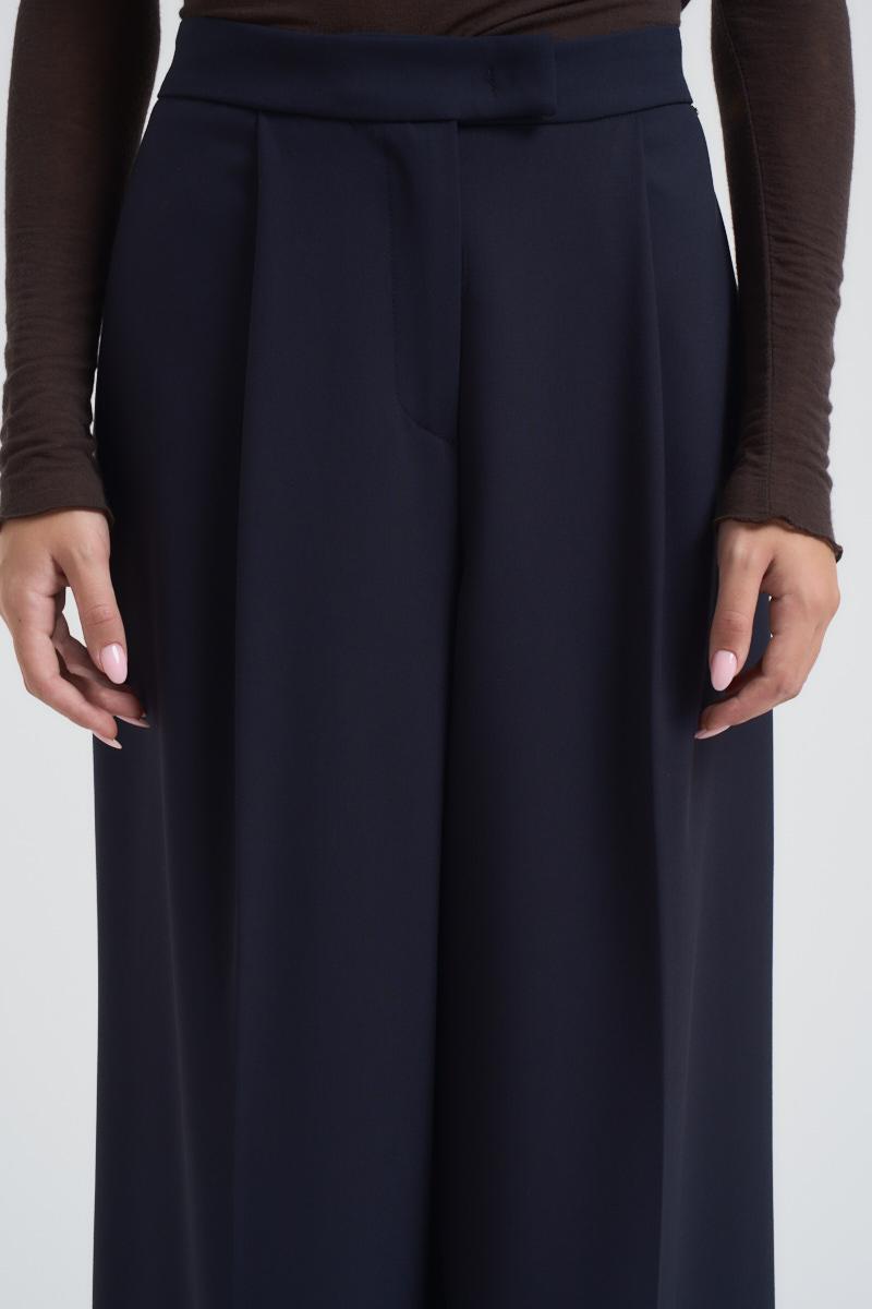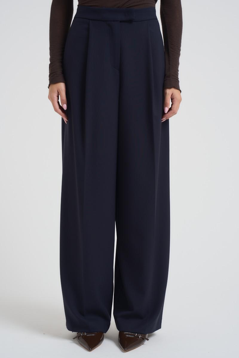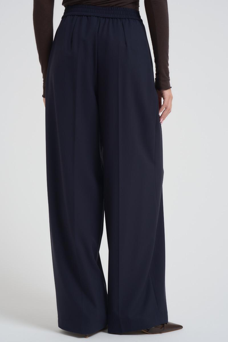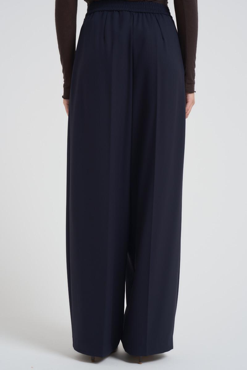 KAOS Pantaloni donna blu con pinces. Modello ampio con elastico dietro, a gamba dritta. Composizione: 63% Poliestere 33% Viscosa 4% Elastan + 100% Poliestere. La modella è alta 172 cm e indossa la taglia 38.