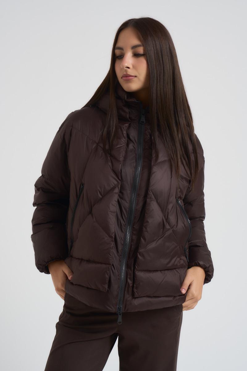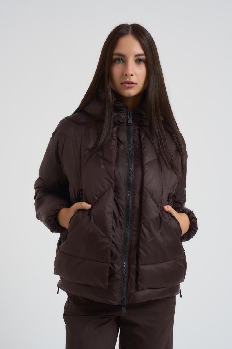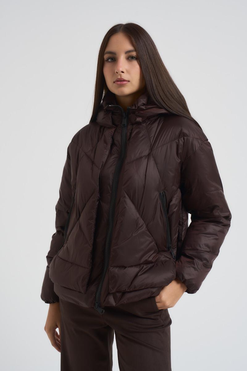 CANADIAN Piumino corto Eugenie marrone. Piumino corto a due strati, imbottito, con cappuccio. Zip alta fino al collo. Sui lati tasche con zip e due chiusure apribili. Composizone: 100% Nylon, imbottitura 100% Poliestere. La modella è alta 176 cm e indossa la taglia S.
