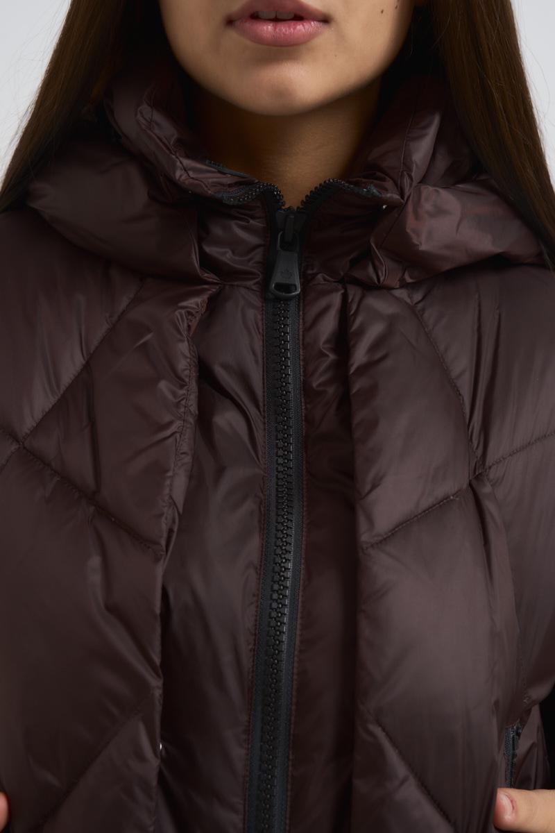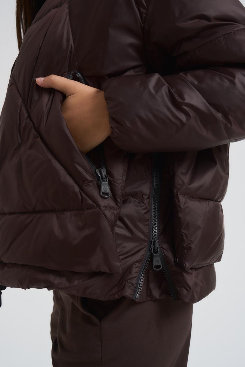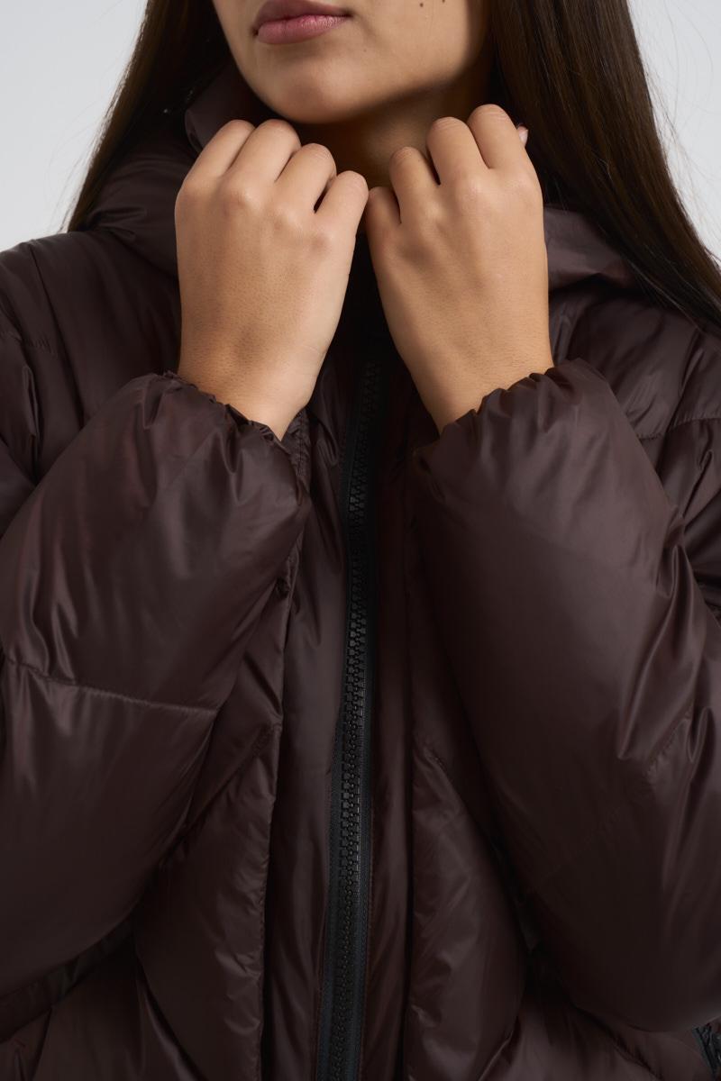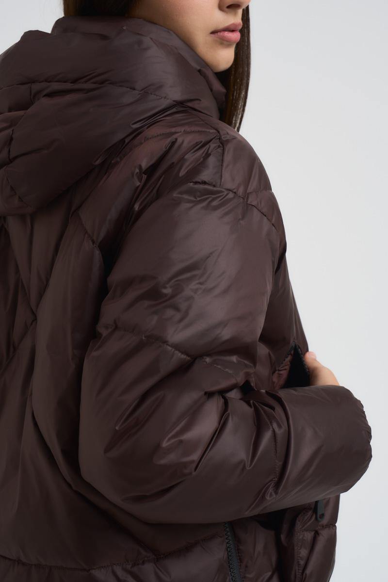 CANADIAN Piumino corto Eugenie marrone. Piumino corto a due strati, imbottito, con cappuccio. Zip alta fino al collo. Sui lati tasche con zip e due chiusure apribili. Composizone: 100% Nylon, imbottitura 100% Poliestere. La modella è alta 176 cm e indossa la taglia S.