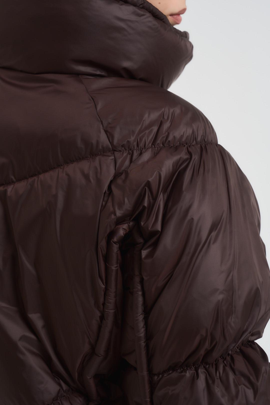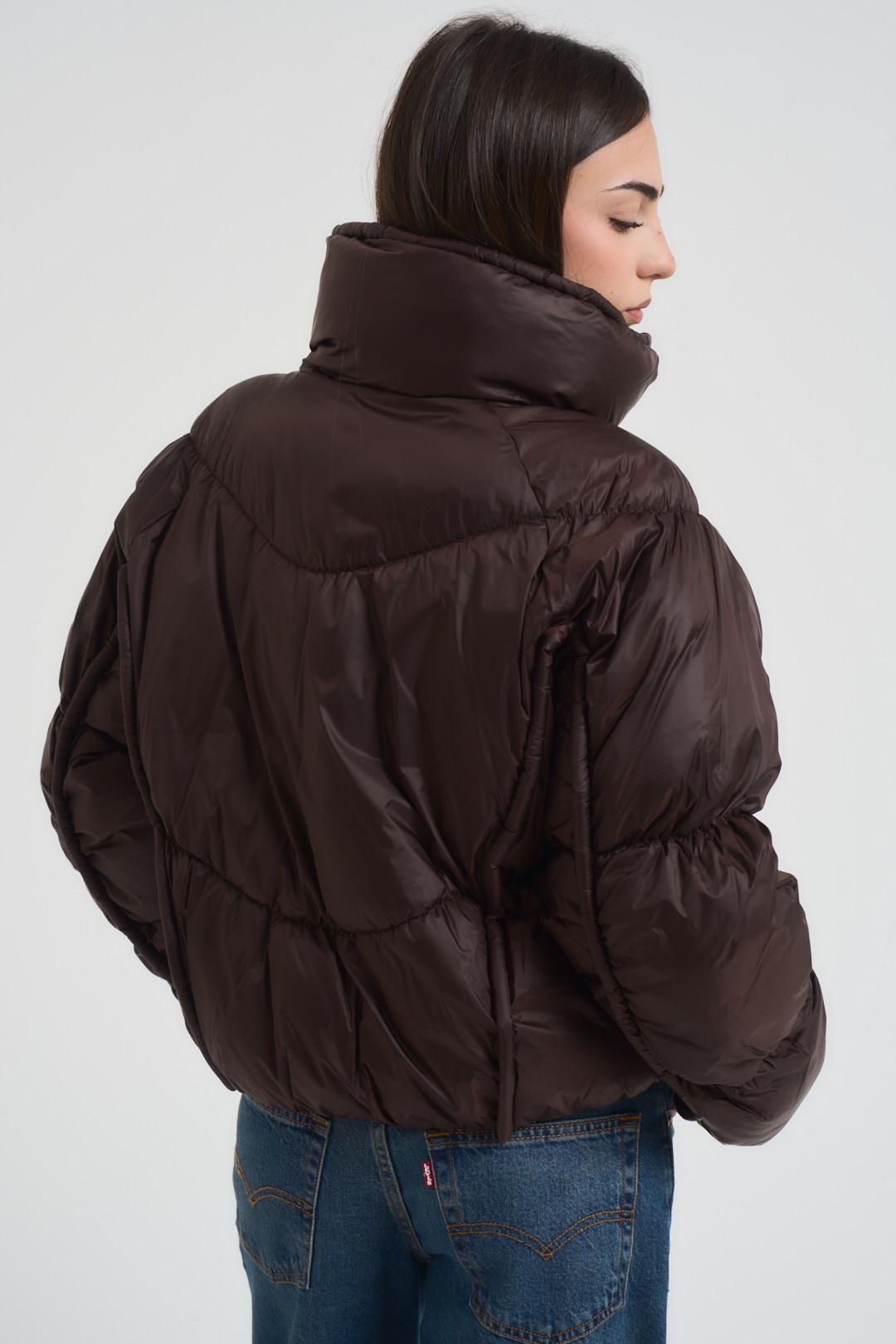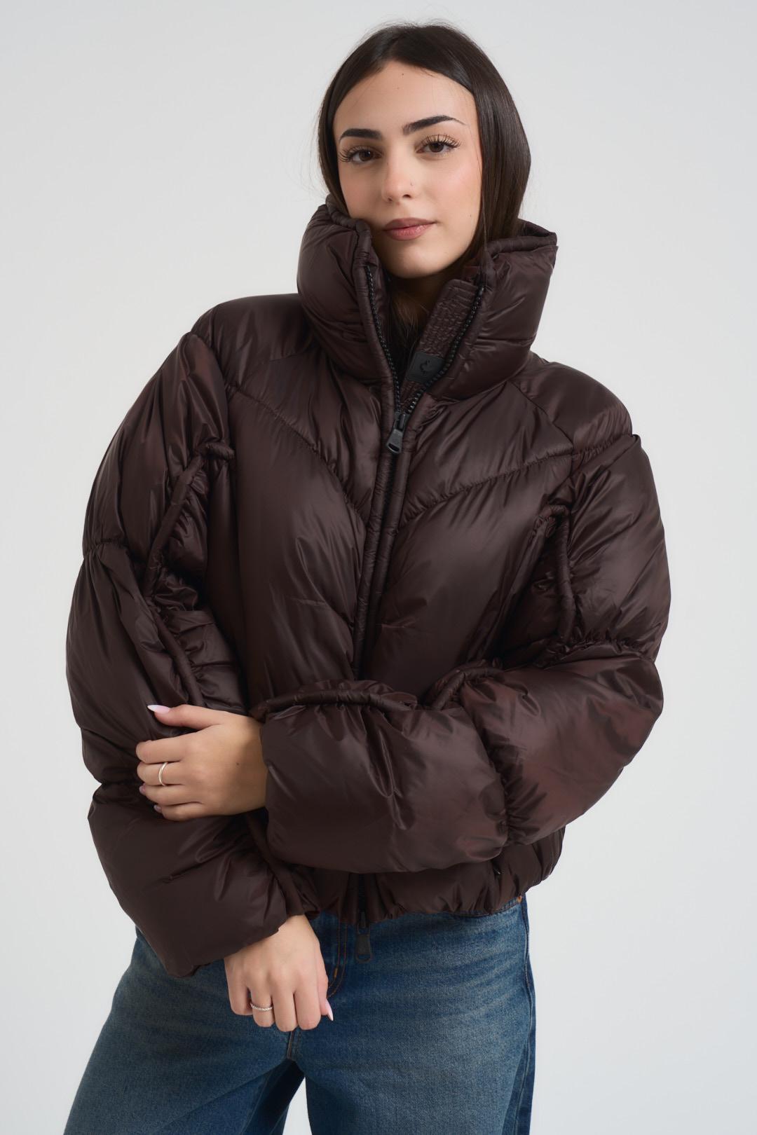 CANADIAN Piumino donna collo alto marrone. Modello corto con motivo su manica e sul davanti. Chiusura con zip alta fino al collo. Due tasche laterali. Composizione: 100% poliammide. Imbottitura: 100% poliestere. La modella è alta 172 cm e indossa la taglia S.