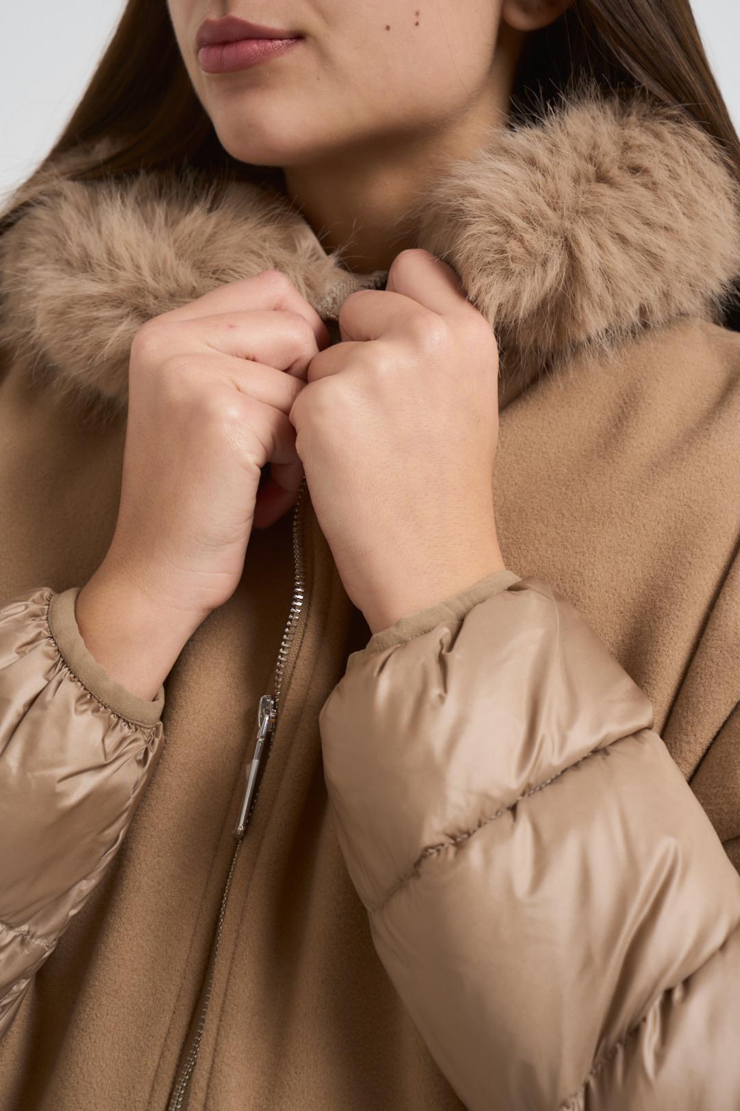 MARKUP Piumino donna con cappa cammello. Modello composto da piumino trapuntato a manica lunga e cappa a mezza manica con collo in ecopelliccia e chiusura con zip centrale. Composizione: poliestere. La modella è alta 176cm e indossa la taglia S.