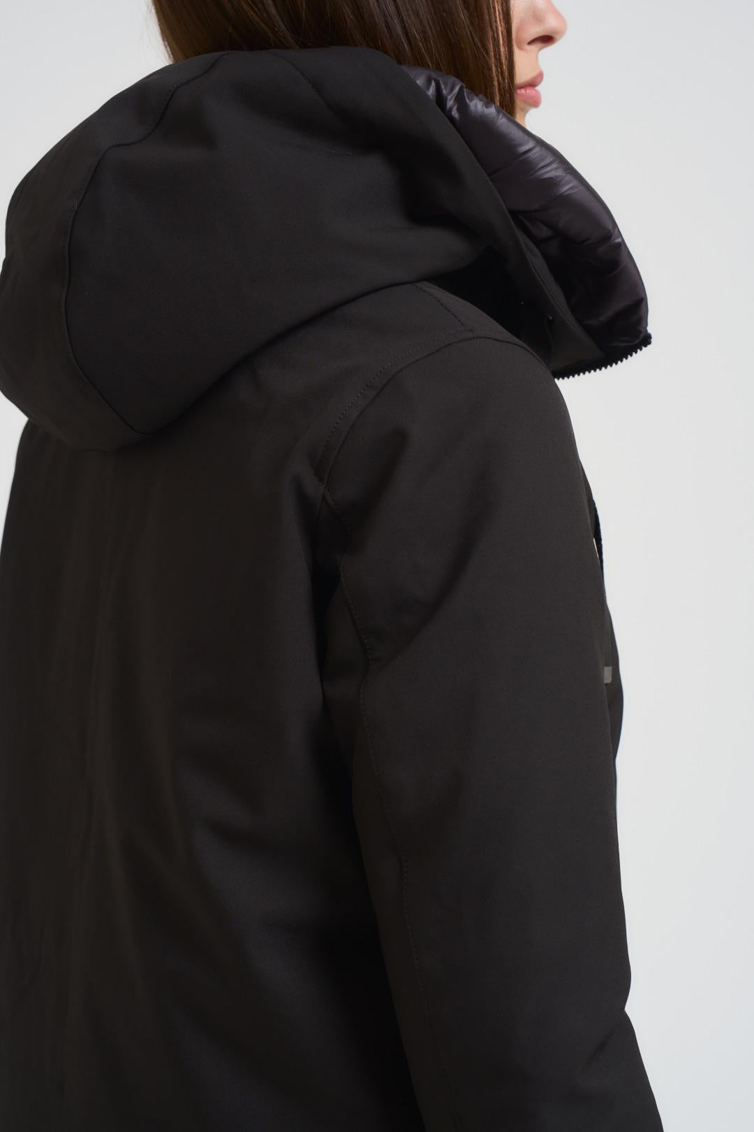 CENSURED Piumino donna lungo nero. Modello con inserti in nylon opaco sul cappuccio e sulla cappa. Chiusura con zip a doppia via fino in cima al collo. Cappuccio con laccio regolatore coulisse. Tasche laterali con zip nascosta. Imbottitura sintetica effetto piuma. Vestibilità comfy. Composizione: 100% poliammide. La modella è alta 176 cm e indossa la taglia S.