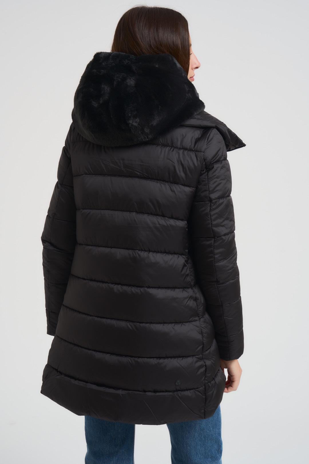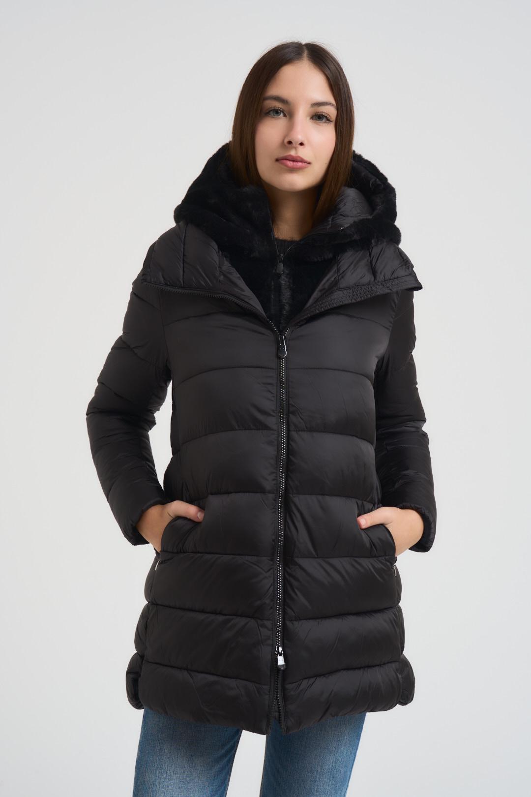SAVE THE DUCK Piumino donna lungo svasato con pettorina e cappuccio in eco pelliccia nero. Chiusura con zip a doppia via. Due tasche esterne con zip. Tessuto idrorepellente e resistente al vento. Imbottitura in Plumtech ecologico. Composizione: 100% Poliestere riciclato. La modella è alta 176 cm e indossa la taglia S.