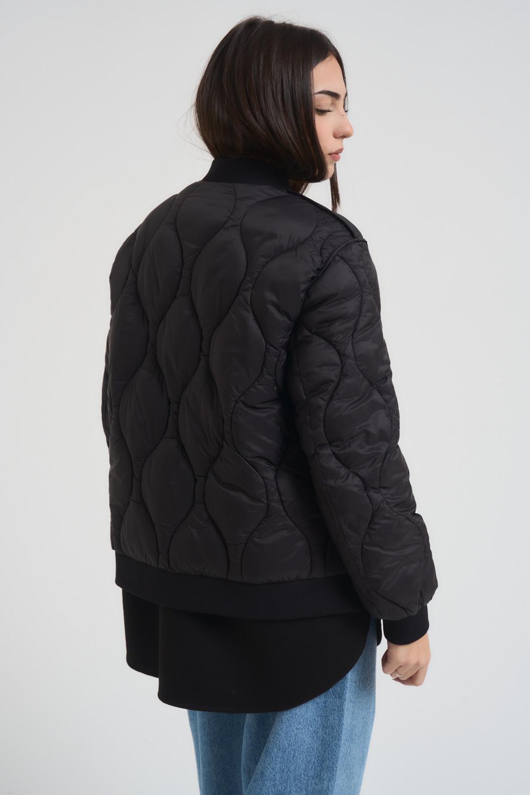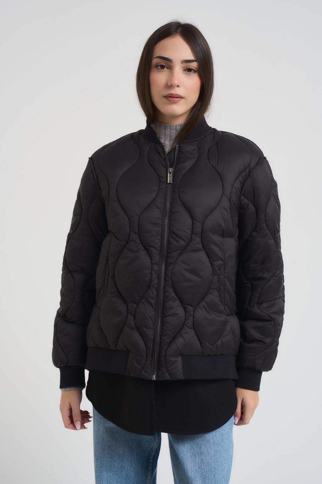 VICOLO Piumino donna trapuntato nero. Modello con inserto inferiore in panno che fuoriesce. Chiusura con zip. Tasche laterali. Spacchi laterali. Colletto, polsi e orlo a costine. Composizione: 51% lana, 45% poliestere, 2% poliamide, 2% acrilico. Imbottitura: 100% poliestere. La modella è alta 172 cm e indossa la taglia S.