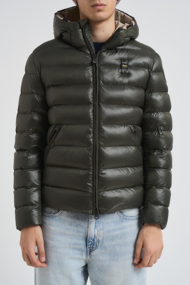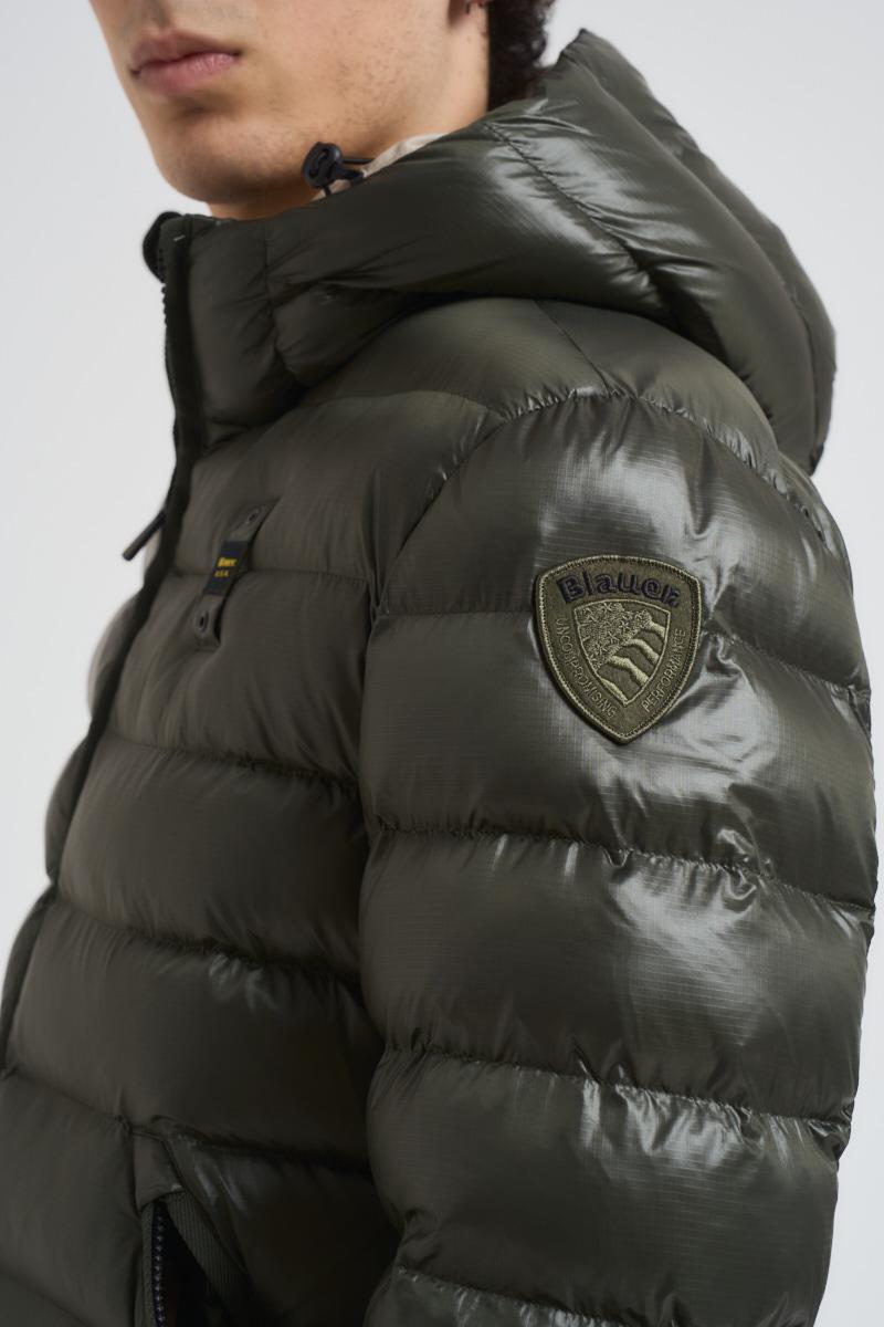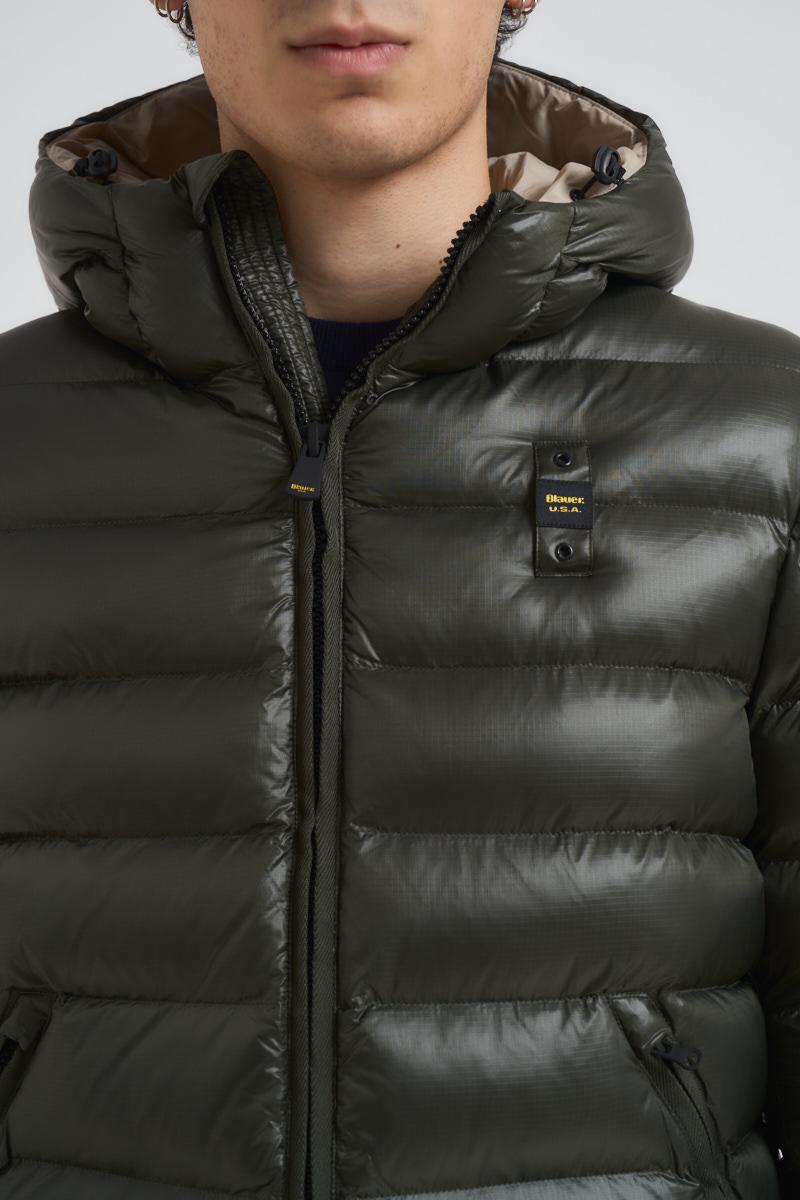 BLAUER Piumino uomo trapuntato verde. Modello con cappuccio fisso, chiusura centrale con zip a doppio cursore. Due tasche frontali con zip verticale e fondo manica con elastico dall'effetto arricciato. Coulisse con tubolare elastico, passante Blauer sul petto e patch sulla manica sinistra. Composizione: 100% nylon. Il modello è alto 190 cm e indossa la taglia L.