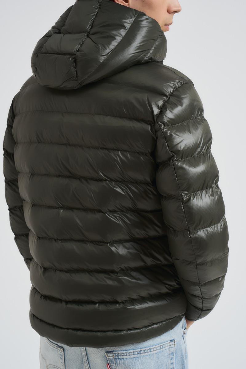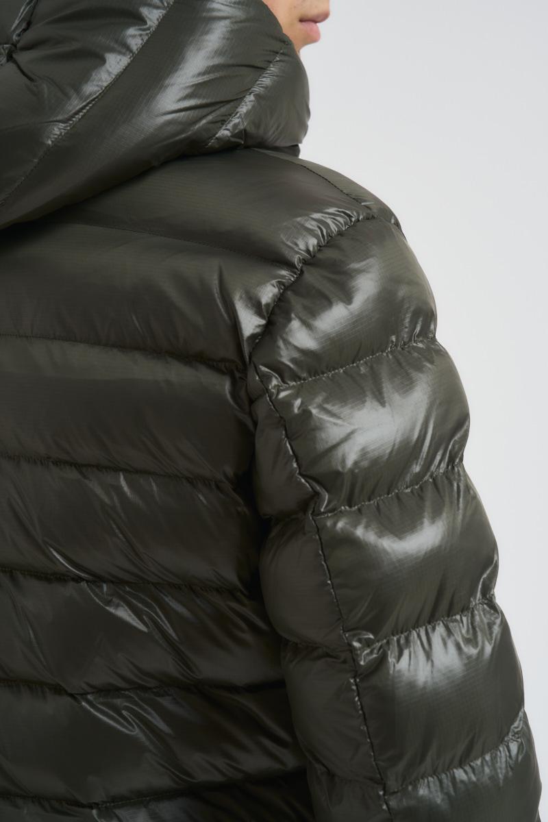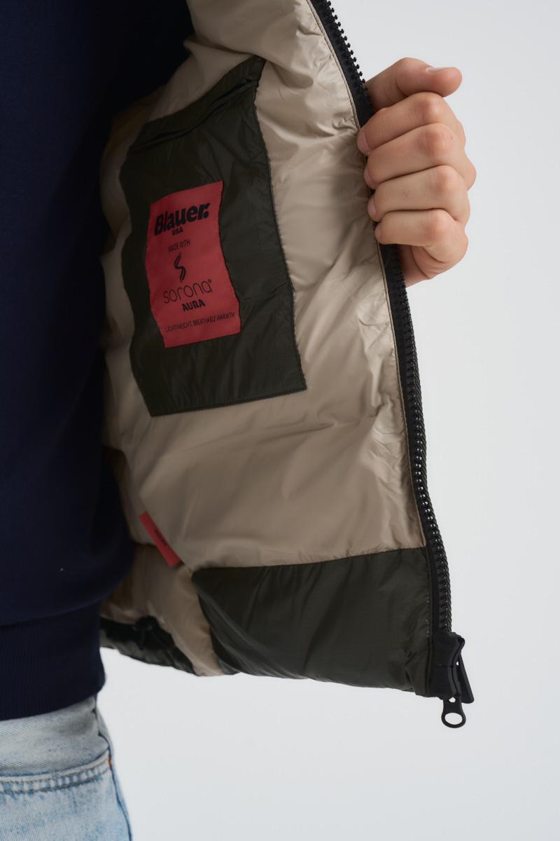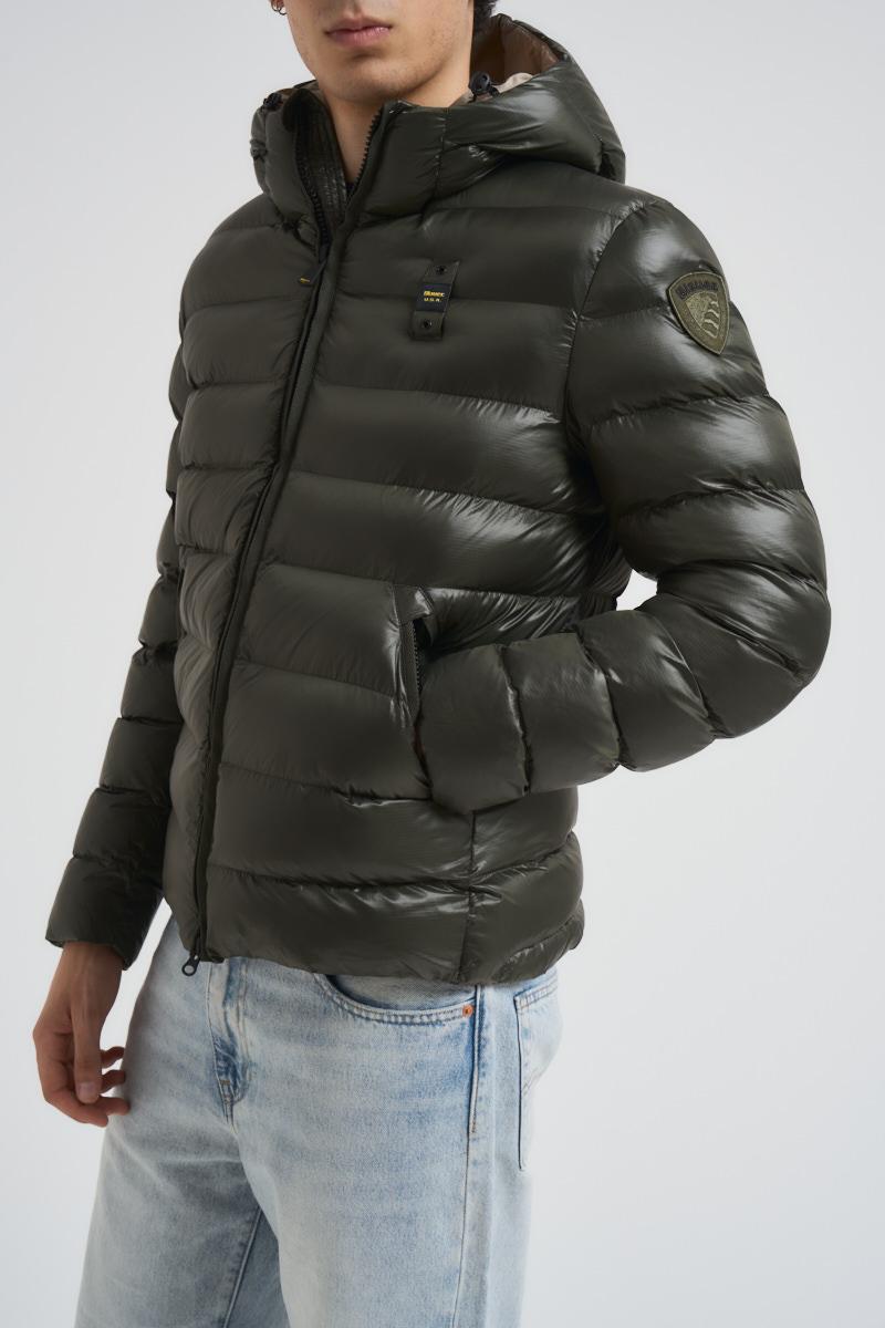 BLAUER Piumino uomo trapuntato verde. Modello con cappuccio fisso, chiusura centrale con zip a doppio cursore. Due tasche frontali con zip verticale e fondo manica con elastico dall'effetto arricciato. Coulisse con tubolare elastico, passante Blauer sul petto e patch sulla manica sinistra. Composizione: 100% nylon. Il modello è alto 190 cm e indossa la taglia L.