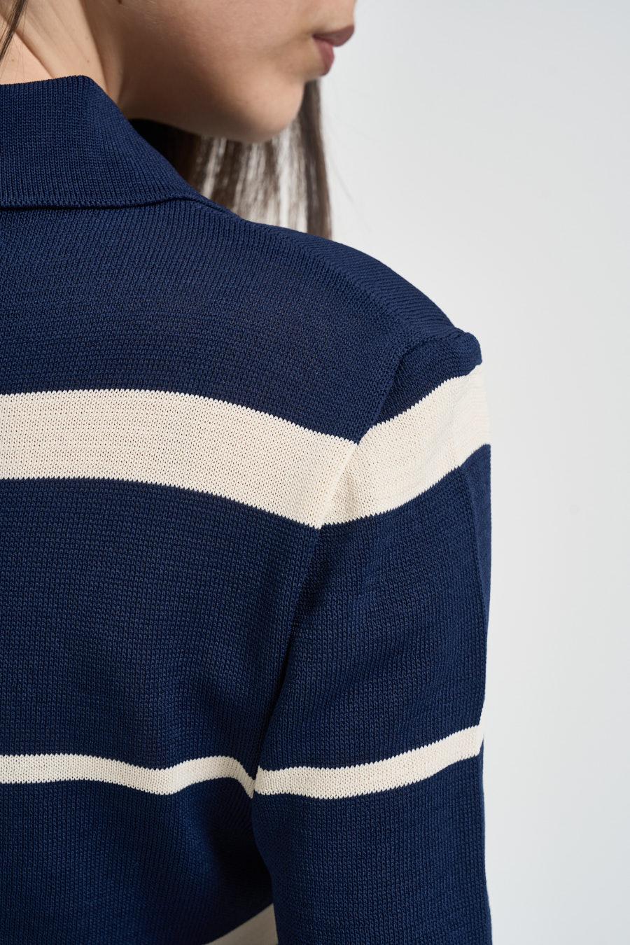 SUSY MIX Polo donna in viscosa a righe blu. Modello con classico colletto e chiusura con bottoncini. Composizione: 63% viscosa 37% nylon. La modella è alta 172cm e indossa la taglia unica.