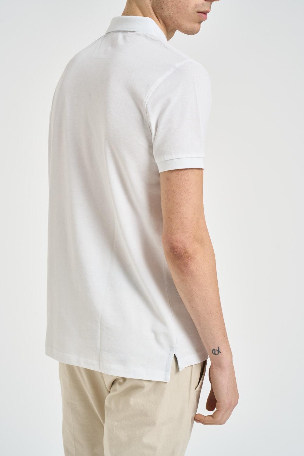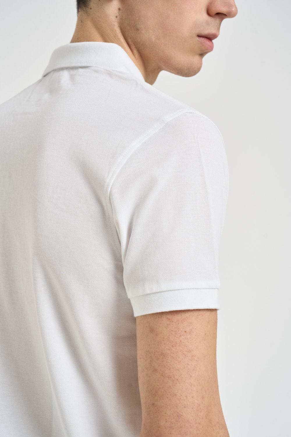 U.S. POLO Polo uomo bianca. Modello a manica corta classico con colletto a polo e chiusura frontale con bottoni. Realizzata in tessuto piqué di cotone, dettaglio iconico con logo ricamato a contrasto sul petto. Finiture con colletto e bordo maniche a costine e piccoli spacchi laterali sul fondo. Composizione: 100% cotone. Il modello è alto 190 cm e indossa la taglia L.