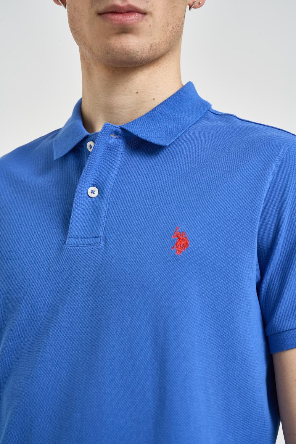 U.S. POLO Polo uomo blu royal. Modello a manica corta classico con colletto a polo e chiusura frontale con bottoni. Realizzata in tessuto piqué di cotone, dettaglio iconico con logo in rosso ricamato a contrasto sul petto. Finiture con colletto e bordo maniche a costine e piccoli spacchi laterali sul fondo. Composizione: 100% cotone. Il modello è alto 190 cm e indossa la taglia L.