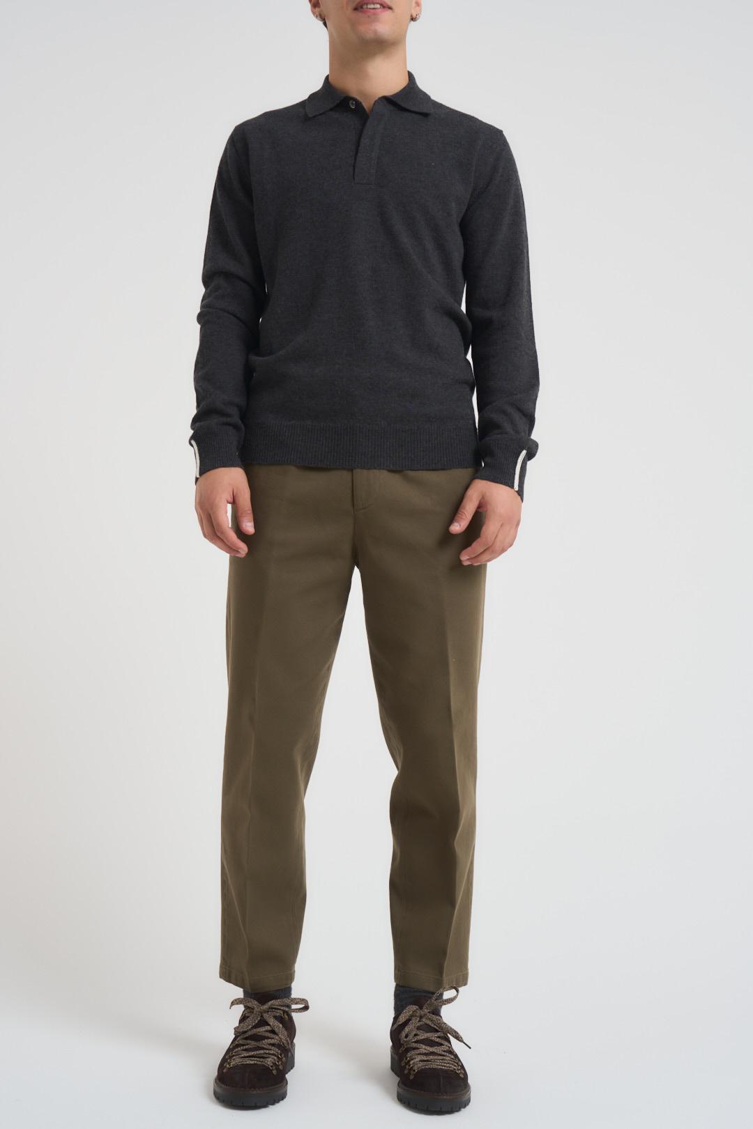 ALPHA STUDIO Polo uomo in maglia antracite. Modello basic in lana geelong. Colletto classico. Chiusura con bottoni nascosti. Maniche lunghe e polsini con dettaglio ricamato in filo in contrasto. Fondo maglia e polsini a coste. Composizione: 100% Lana geelong. Il modello è alto 185 cm e indossa la taglia L.