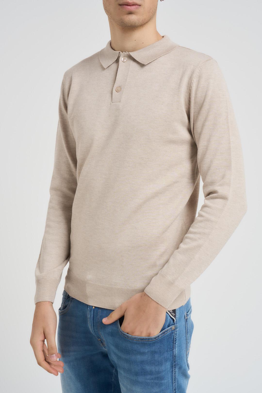 SSEINSE Polo uomo in maglia beige. Modello con classcico colletto, manica lunga e chiusura con bottoncini. Orli a costine. Composizione: misto viscosa. Il modello è alto 190cm e indossa la taglia L.